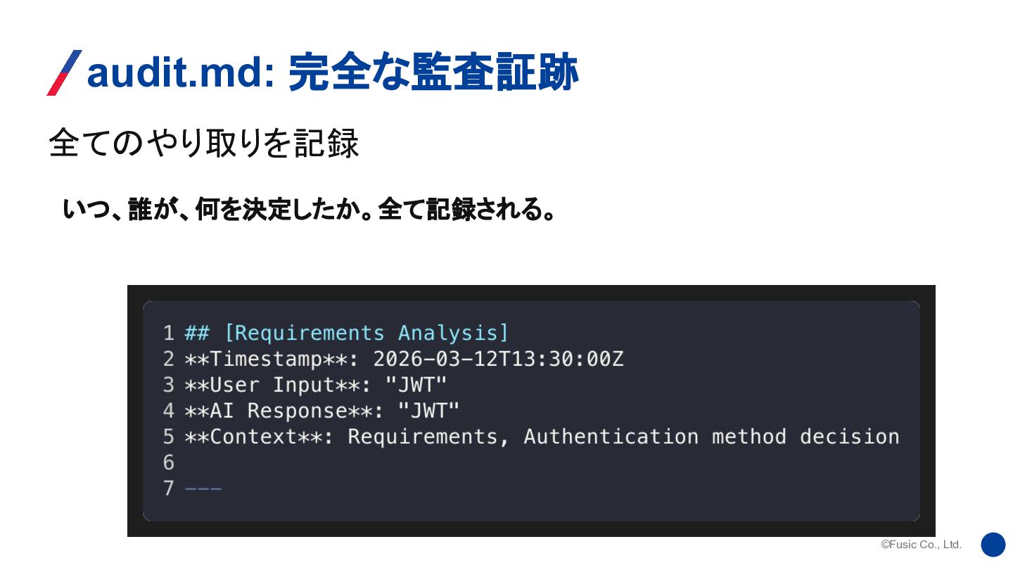 ©Fusic Co., Ltd. 全てのやり取りを記録 audit.md: 完全な監査証跡 いつ、誰が、何を決定したか。全て記録される。