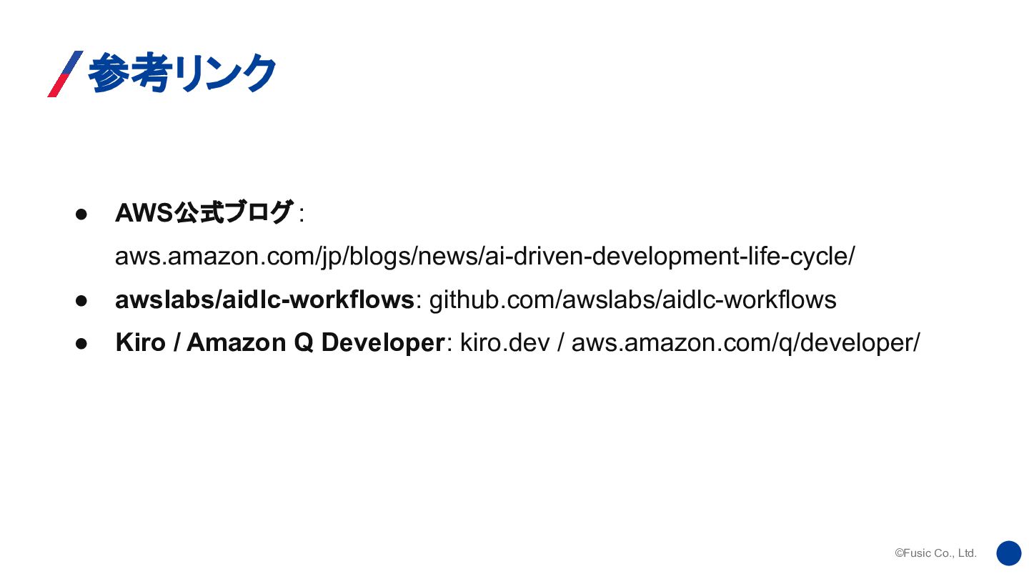 ©Fusic Co., Ltd. 参考リンク • AWS公式ブログ : aws.amazon.com/jp/blogs/news/ai-driven-development-life-cycle/ • awslabs/aidlc-workflows: