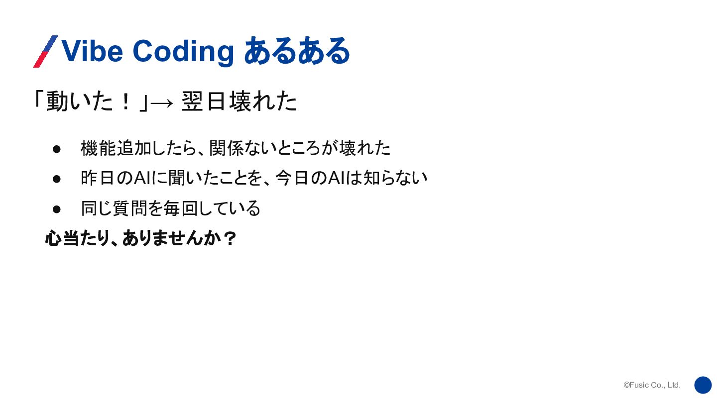 ©Fusic Co., Ltd. 「動いた!」→ 翌日壊れた Vibe Coding あるある • 機能追加したら、関係ないところが壊れた