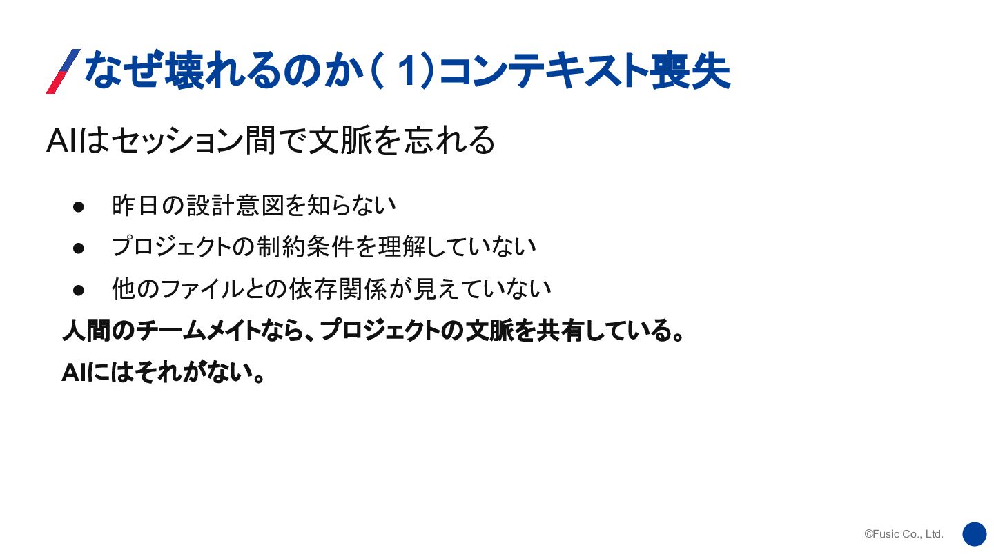 ©Fusic Co., Ltd. AIはセッション間で文脈を忘れる なぜ壊れるのか( 1)コンテキスト喪失 • 昨日の設計意図を知らない • プロジェクトの制約条件を理解していない