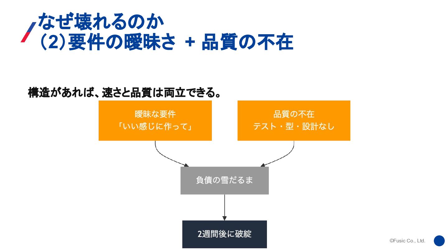 ©Fusic Co., Ltd. なぜ壊れるのか (2)要件の曖昧さ + 品質の不在 構造があれば、速さと品質は両立できる。