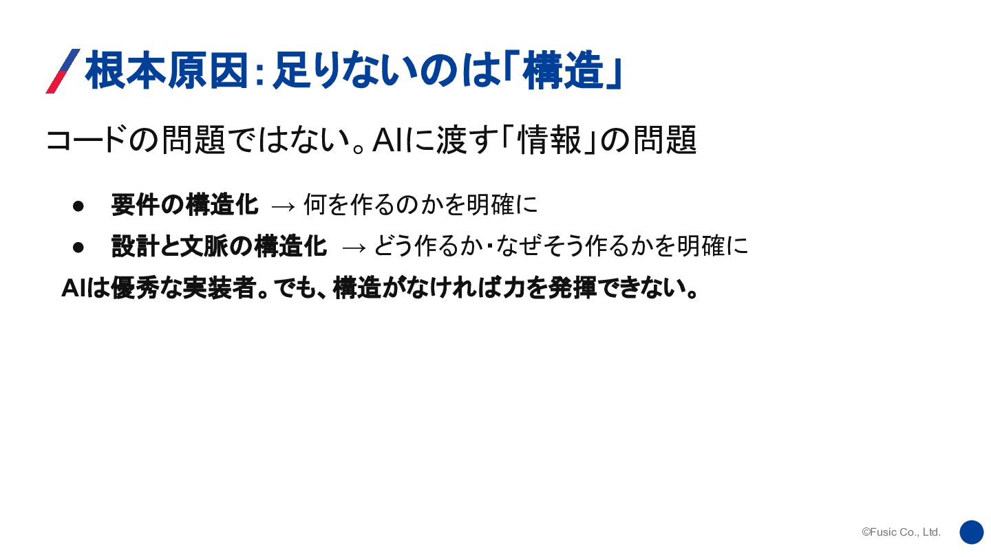 ©Fusic Co., Ltd. コードの問題ではない。AIに渡す「情報」の問題 根本原因:足りないのは「構造」 • 要件の構造化 → 何を作るのかを明確に •