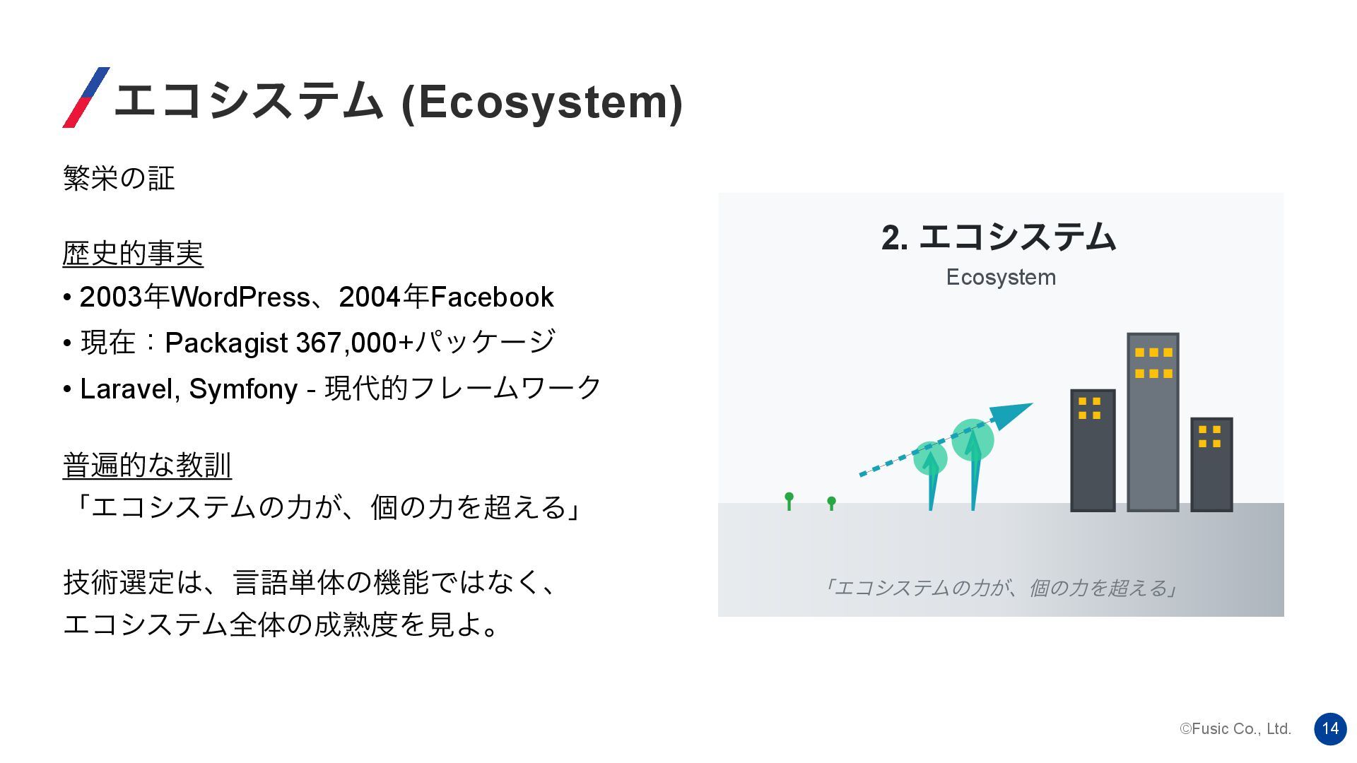 • ݱࡏɿPackagist 367,000+ύοέʔδ • Laravel, Symfony - ݱతϑϨʔϜϫʔΫ ීวతͳڭ܇ ʮΤίγεςϜͷྗ͕ɺݸͷྗΛ͑Δʯ ٕज़બఆɺݴޠ୯ମͷػೳͰͳ͘ɺ ΤίγεςϜશମͷख़ΛݟΑɻ 2. ΤίγεςϜ Ecosystem ʮΤίγεςϜͷྗ͕ɺݸͷྗΛ͑Δʯ