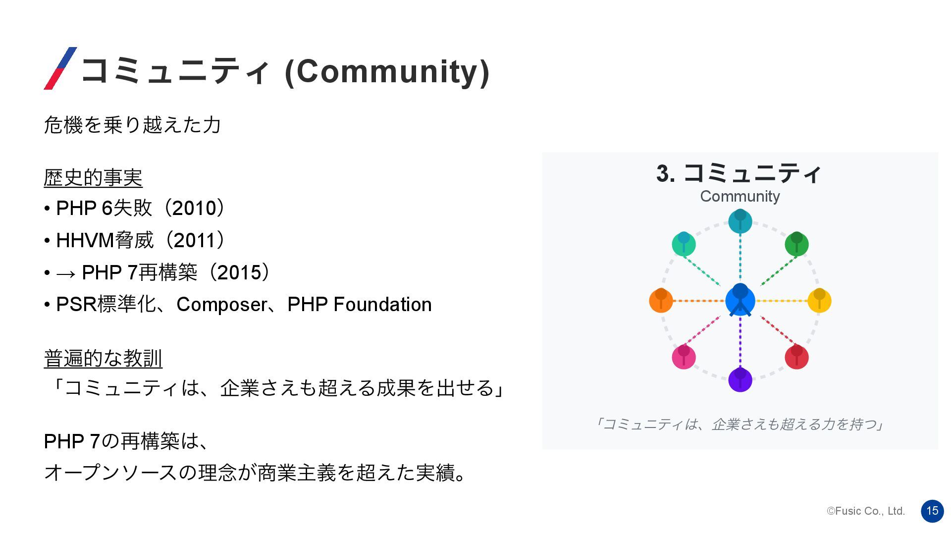 6ࣦഊʢ2010ʣ • HHVMڴҖʢ2011ʣ • → PHP 7࠶ߏஙʢ2015ʣ • PSRඪ४ԽɺComposerɺPHP Foundation ීวతͳڭ܇ ʮίϛϡχςΟɺاۀ͑͑͞ΔՌΛग़ͤΔʯ PHP 7ͷ࠶ߏஙɺ Φʔϓϯιʔεͷཧ೦͕ۀओٛΛ࣮͑ͨɻ 3. ίϛϡχςΟ Community ʮίϛϡχςΟɺاۀ͑͑͞ΔྗΛ࣋ͭʯ