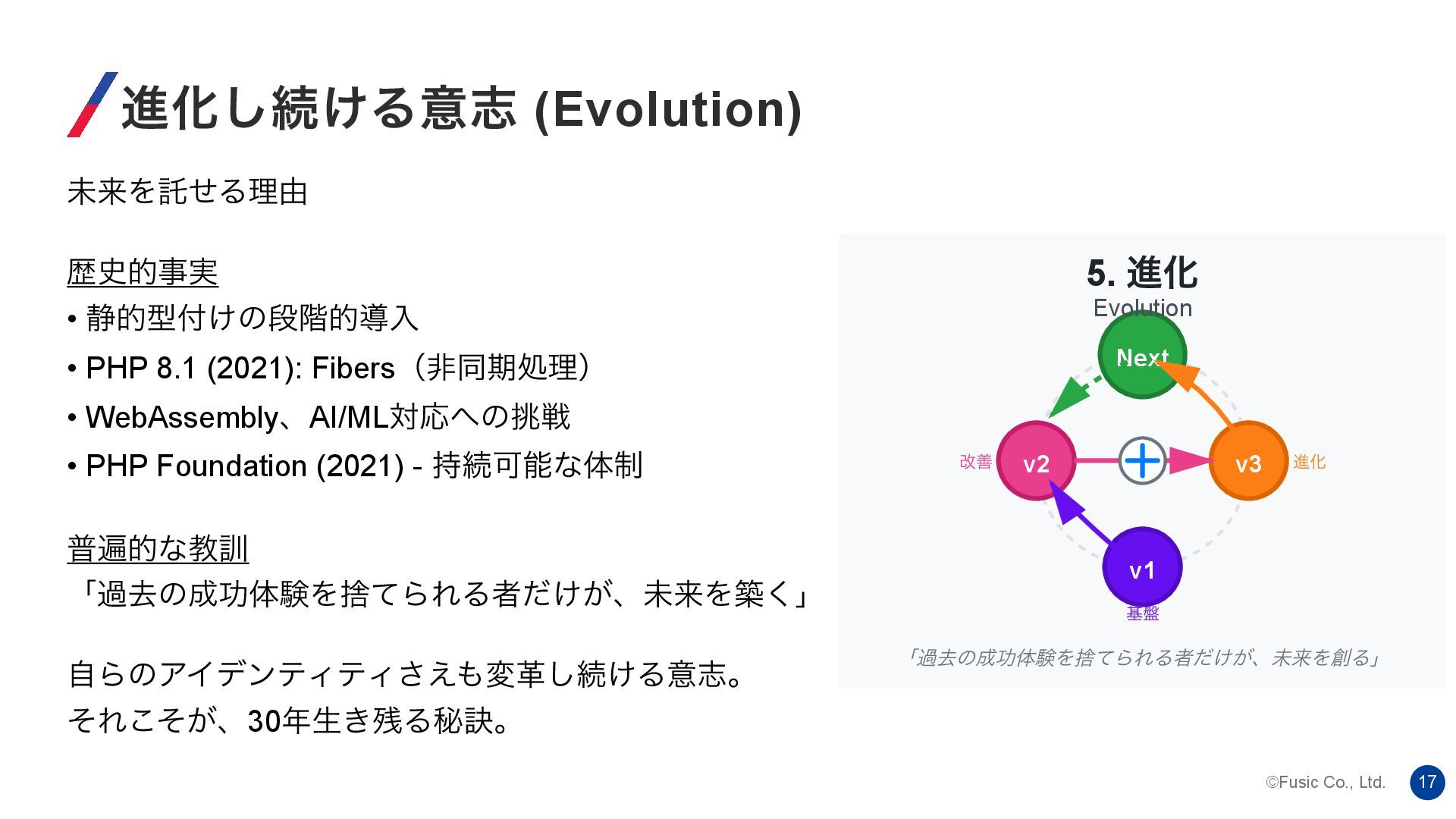 • PHP 8.1 (2021): Fibersʢඇಉظॲཧʣ • WebAssemblyɺAI/MLରԠͷઓ • PHP Foundation (2021) - ࣋ଓՄೳͳମ੍ ීวతͳڭ܇ ʮաڈͷޭମݧΛࣺͯΒΕΔऀ͚͕ͩɺະདྷΛங͘ʯ ࣗΒͷΞΠσϯςΟςΟ͑͞มֵ͠ଓ͚Δҙࢤɻ ͦΕ͕ͦ͜ɺ30ੜ͖Δൿ݃ɻ v1 ج൫ v2 վળ v3 ਐԽ Next ະདྷ 5. ਐԽ Evolution ʮաڈͷޭମݧΛࣺͯΒΕΔऀ͚͕ͩɺະདྷΛΔʯ