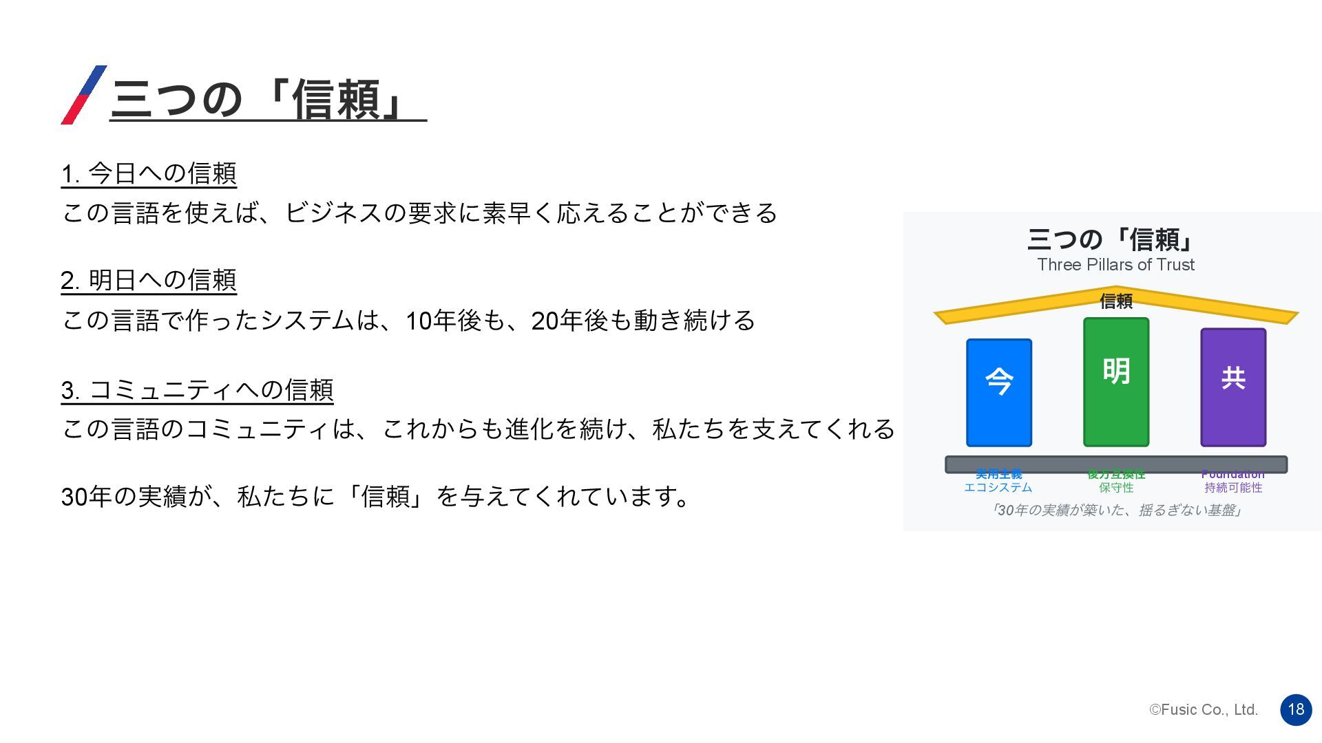 ©Fusic Co., Ltd. 18 ࡾͭͷʮ৴པʯ 1. ࠓͷ৴པ ͜ͷݴޠΛ͑ɺϏδωεͷཁٻʹૉૣ͘Ԡ͑Δ͜ͱ͕Ͱ͖Δ 2. ໌ͷ৴པ