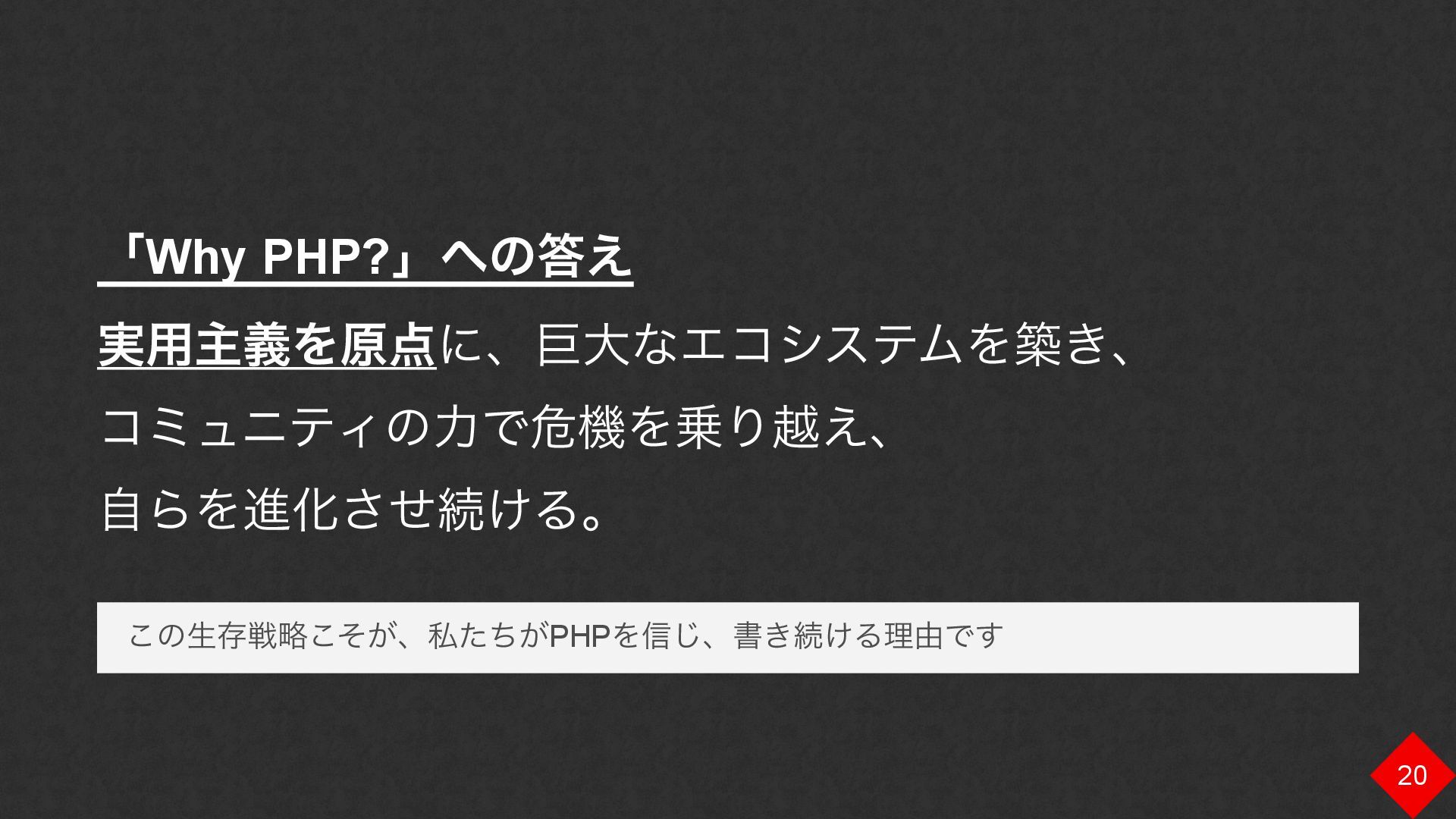 ʮWhy PHP?ʯͷ͑ ࣮༻ओٛΛݪʹɺڊେͳΤίγεςϜΛங͖ɺ ίϛϡχςΟͷྗͰةػΛΓӽ͑ɺ ࣗΒΛਐԽͤ͞ଓ͚Δɻ ͜ͷੜଘઓུ͕ͦ͜ɺࢲ͕ͨͪPHPΛ৴͡ɺॻ͖ଓ͚Δཧ༝Ͱ͢ 20