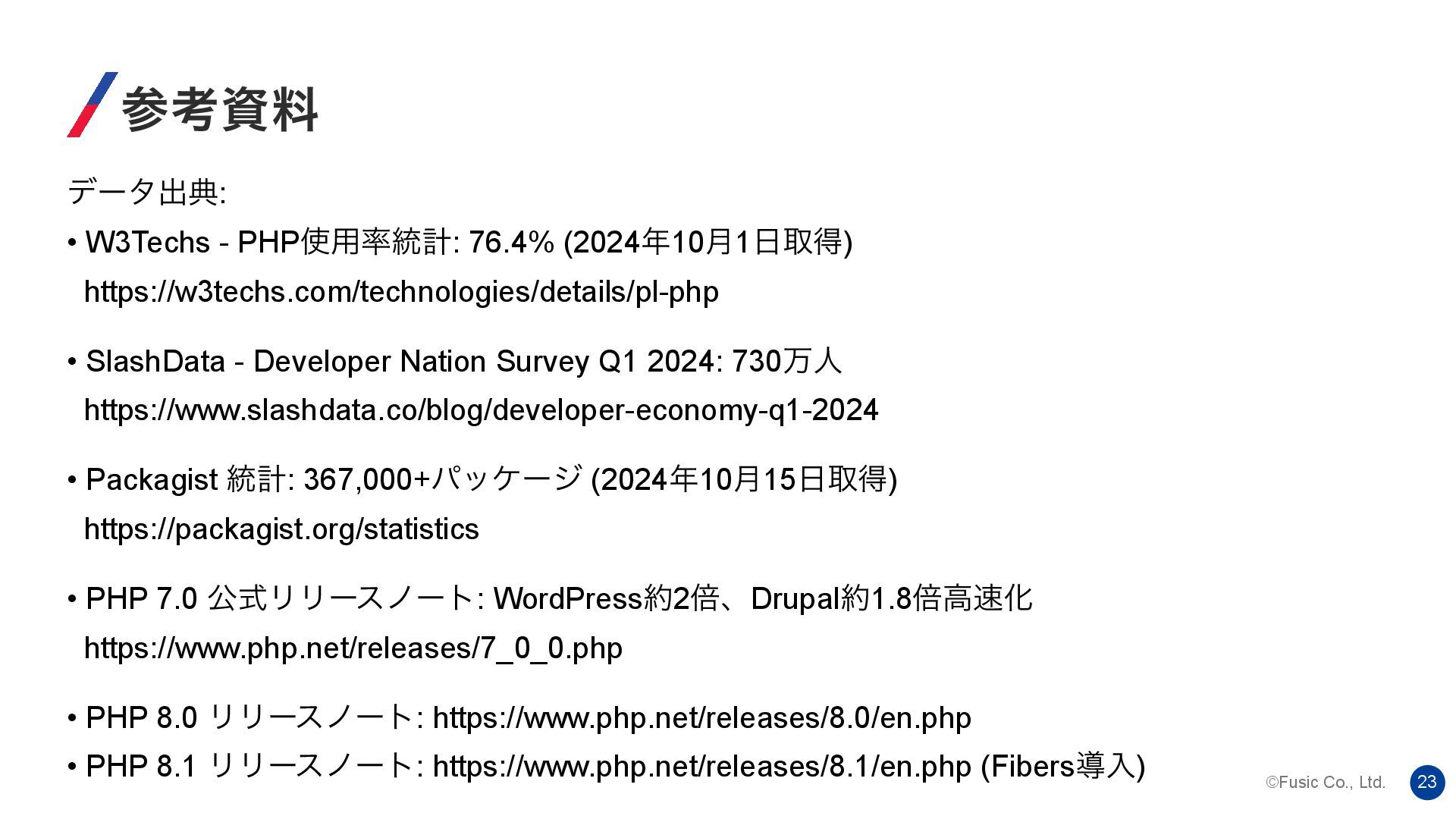 ©Fusic Co., Ltd. 23 ࢀߟࢿྉ σʔλग़య: • W3Techs - PHP༻౷ܭ: