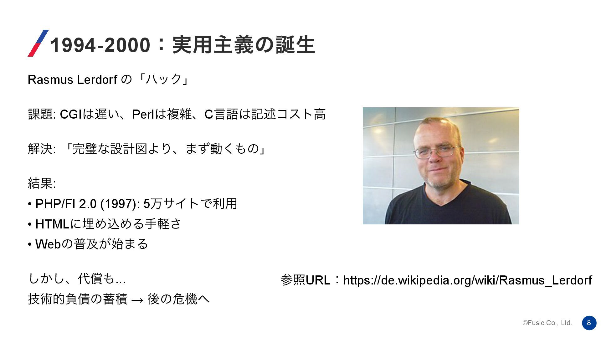 ©Fusic Co., Ltd. 8 1994-2000ɿ࣮༻ओٛͷੜ Rasmus Lerdorf ͷʮϋοΫʯ ՝: CGI͍ɺPerlෳࡶɺCݴޠهड़ίετߴ