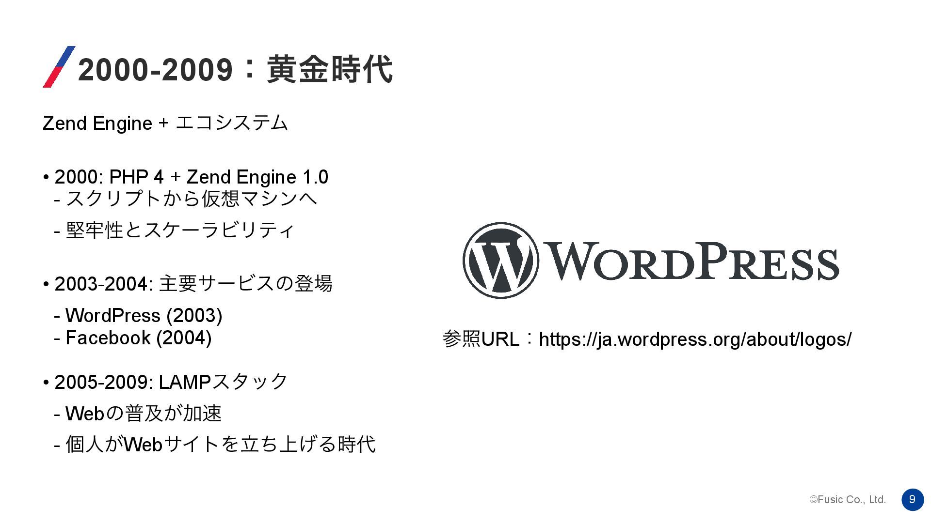 2000: PHP 4 + Zend Engine 1.0 - εΫϦϓτ͔ΒԾϚγϯ - ݎ࿚ੑͱεέʔϥϏϦςΟ • 2003-2004: ओཁαʔϏεͷొ - WordPress (2003) - Facebook (2004) • 2005-2009: LAMPελοΫ - Webͷීٴ͕Ճ - ݸਓ͕WebαΠτΛ্ཱͪ͛Δ࣌ ࢀরURLɿhttps://ja.wordpress.org/about/logos/