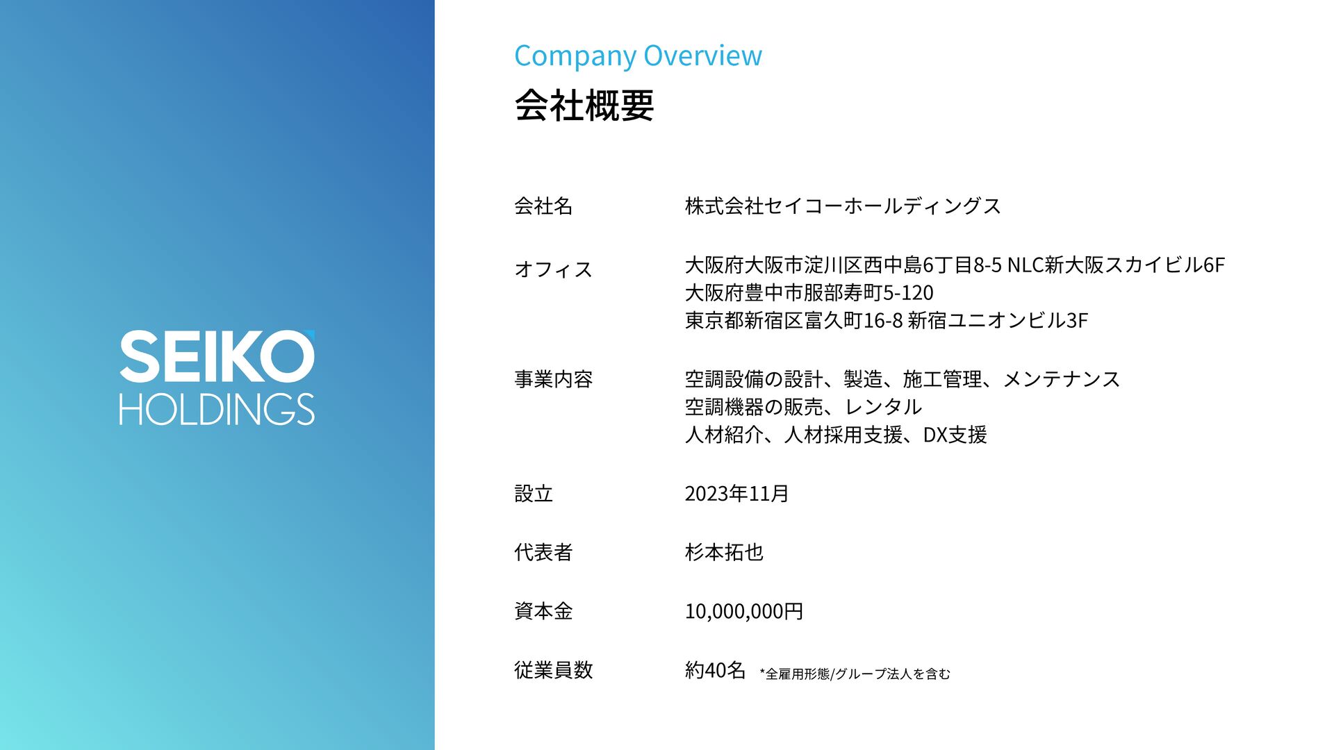 株式会社セイコーホールディングス 大阪府大阪市淀川区西中島6丁目8-5 NLC新大阪スカイビル6F 大阪府豊中市服部寿町5-120 東京都新宿区富久町16-8 新宿ユニオンビル3F 空調設備の設計、製造、施工管理、メンテナンス 空調機器の販売、レンタル 人材紹介、人材採用支援、DX支援 2023年11月 杉本拓也 10,000,000円 約40名 *全雇用形態/グループ法人を含む