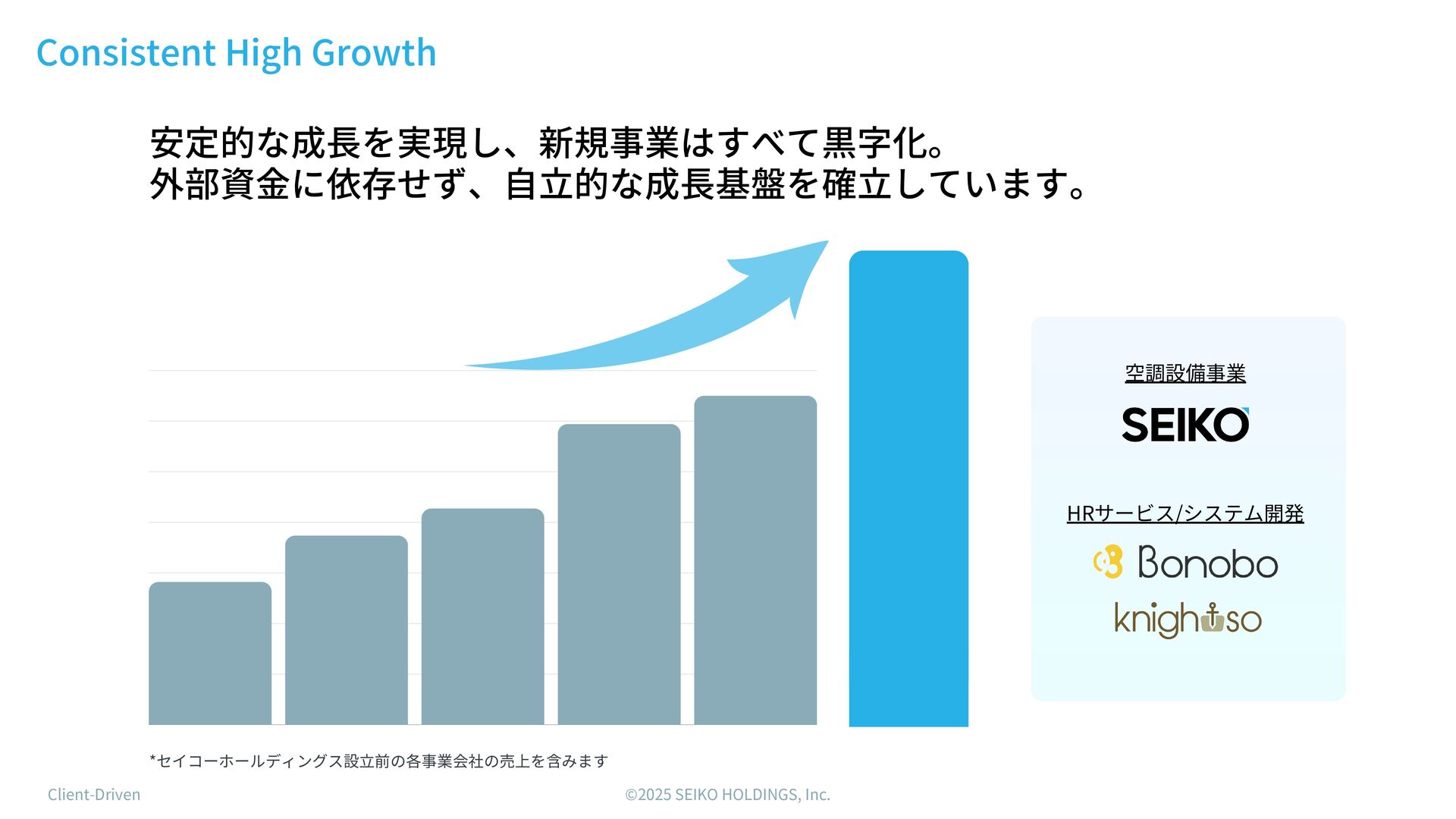 安定的な成長を実現し、新規事業はすべて黒字化。 外部資金に依存せず、自立的な成長基盤を確立しています。 Consistent High Growth *セイコーホールディングス設立前の各事業会社の売上を含みます 空調設備事業 HRサービス/システム開発 Client-Driven ©2025
