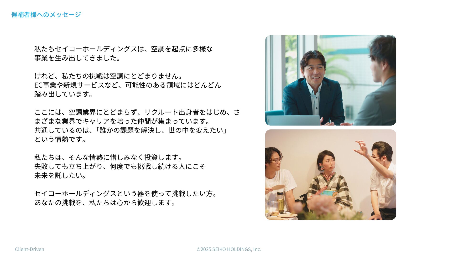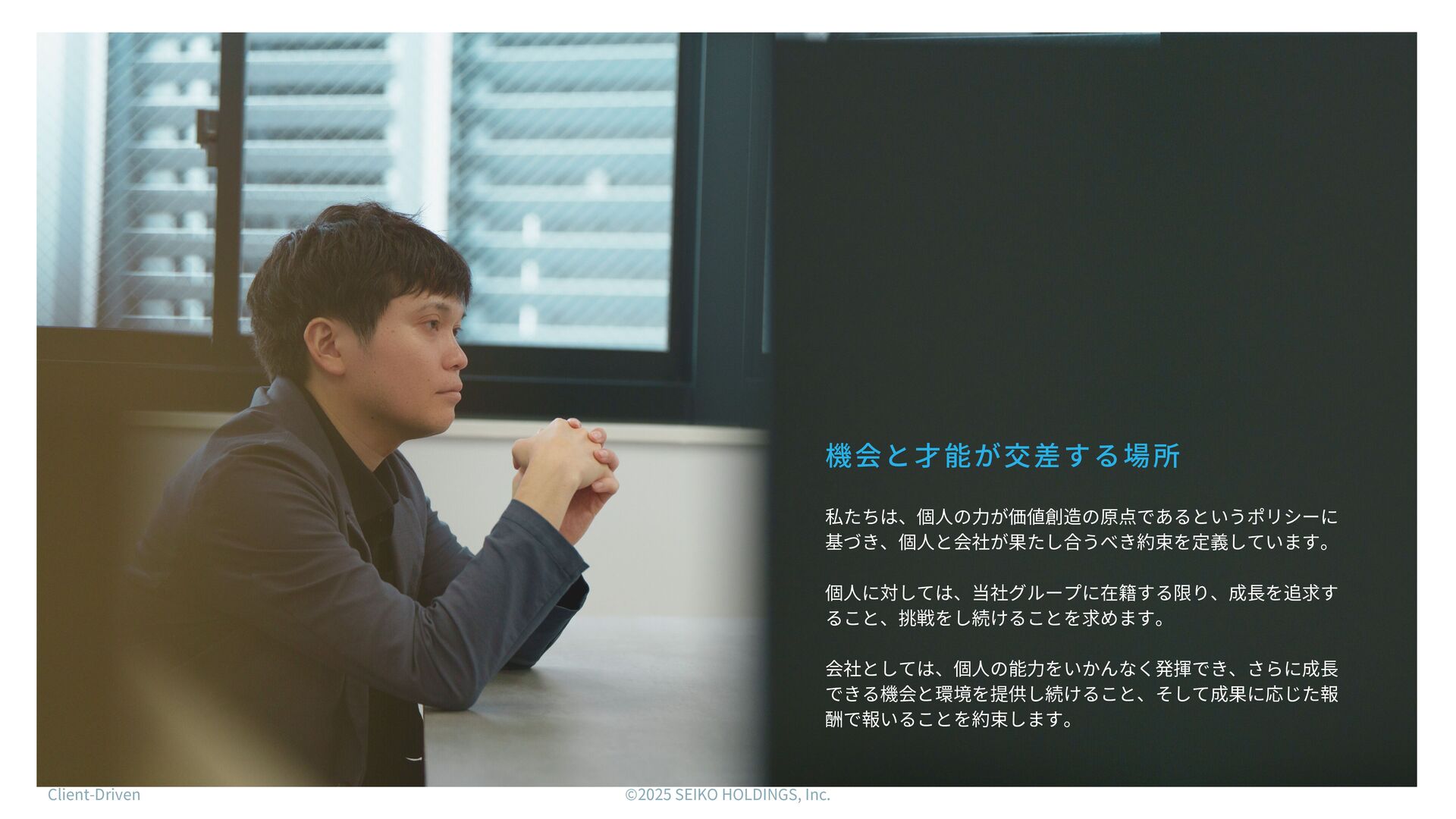私たちは、そんな情熱に惜しみなく投資します。 失敗しても立ち上がり、何度でも挑戦し続ける人にこそ 未来を託したい。 セイコーホールディングスという器を使って挑戦したい方。 あなたの挑戦を、私たちは心から歓迎します。 Client-Driven 候補者様へのメッセージ ©2025 SEIKO HOLDINGS, Inc.