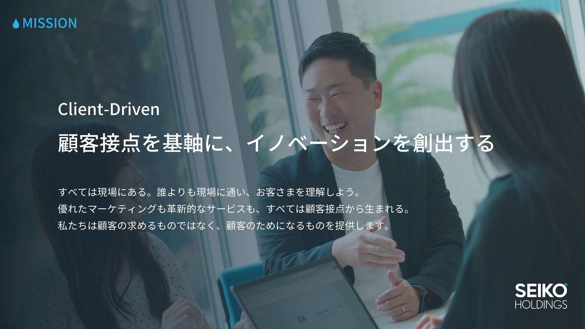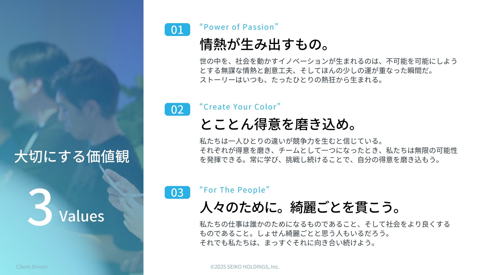とことん得意を磨き込め。 “Create Your Color” 私たちは一人ひとりの違いが競争力を生むと信じている。 それぞれが得意を磨き、チームとして一つになったとき、私たちは無限の可能性 を発揮できる。常に学び、挑戦し続けることで、自分の得意を磨き込もう。 02 人々のために。綺麗ごとを貫こう。 “For The People” 私たちの仕事は誰かのためになるものであること、そして社会をより良くする ものであること。しょせん綺麗ごとと思う人もいるだろう。 それでも私たちは、まっすぐそれに向き合い続けよう。 03 Client-Driven ©2025 SEIKO HOLDINGS, Inc.