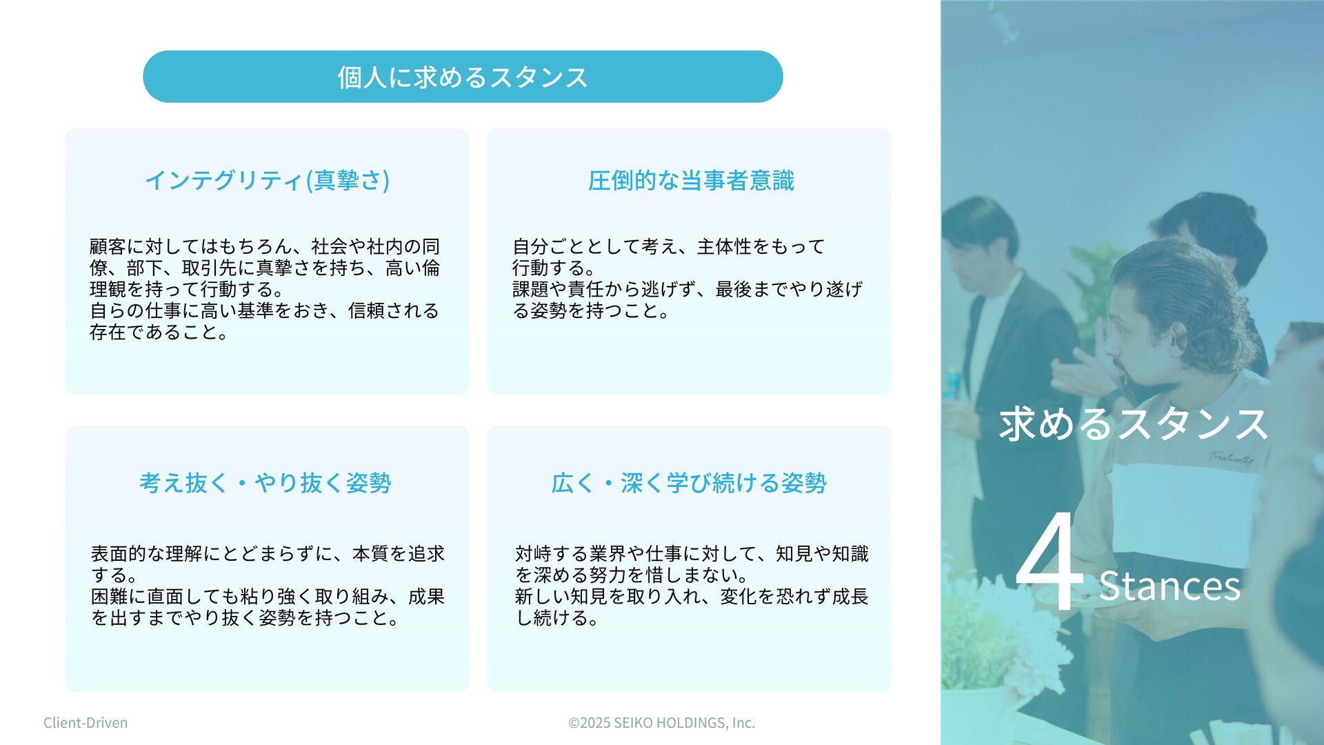 る姿勢を持つこと。 考え抜く・やり抜く姿勢 表面的な理解にとどまらずに、本質を追求 する。 困難に直面しても粘り強く取り組み、成果 を出すまでやり抜く姿勢を持つこと。 広く・深く学び続ける姿勢 対峙する業界や仕事に対して、知見や知識 を深める努力を惜しまない。 新しい知見を取り入れ、変化を恐れず成長 し続ける。 求めるスタンス 4Stances 個人に求めるスタンス Client-Driven ©2025 SEIKO HOLDINGS, Inc.