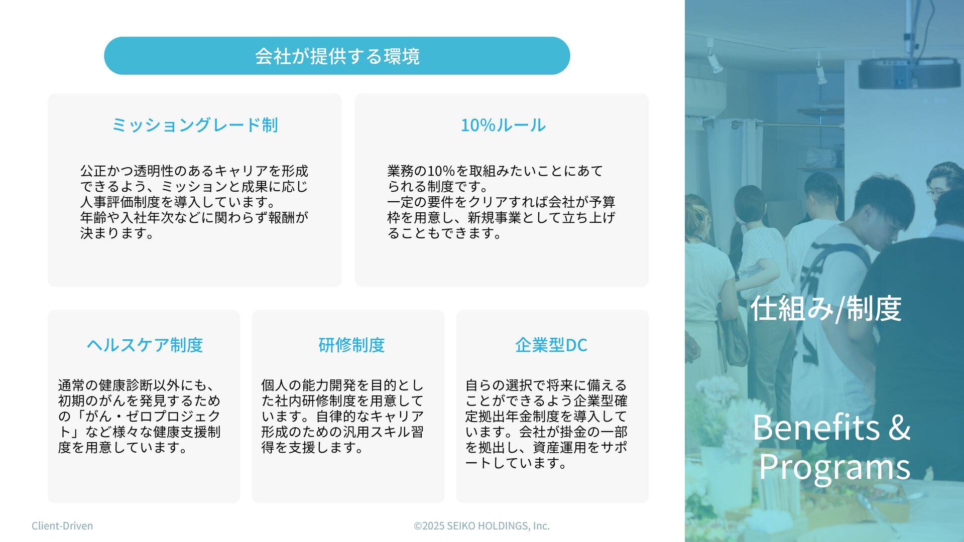 枠を用意し、新規事業として立ち上げ ることもできます。 ヘルスケア制度 通常の健康診断以外にも、 初期のがんを発見するため の「がん・ゼロプロジェク ト」など様々な健康支援制 度を用意しています。 仕組み/制度 Benefits & Programs 研修制度 個人の能力開発を目的とし た社内研修制度を用意して います。自律的なキャリア 形成のための汎用スキル習 得を支援します。 企業型DC 自らの選択で将来に備える ことができるよう企業型確 定拠出年金制度を導入して います。会社が掛金の一部 を拠出し、資産運用をサポ ートしています。 会社が提供する環境 Client-Driven ©2025 SEIKO HOLDINGS, Inc.