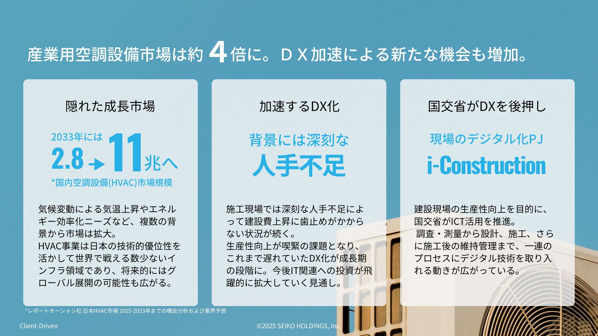 ローバル展開の可能性も広がる。 2.8 兆へ *国内空調設備(HVAC)市場規模 2033年には 人手不足 背景には深刻な 施工現場では深刻な人手不足によ って建設費上昇に歯止めがかから ない状況が続く。 生産性向上が喫緊の課題となり、 これまで遅れていたDX化が成長期 の段階に。今後IT関連への投資が飛 躍的に拡大していく見通し。 i-Construction 現場のデジタル化PJ 建設現場の生産性向上を目的に、 国交省がICT活用を推進。 調査・測量から設計、施工、さら に施工後の維持管理まで、一連の プロセスにデジタル技術を取り入 れる動きが広がっている。 産業用空調設備市場は約 倍に。DX加速による新たな機会も増加。 Client-Driven 4 *レポートオーシャン社 日本HVAC市場 2025-2033年までの機会分析および業界予想 ©2025 SEIKO HOLDINGS, Inc.