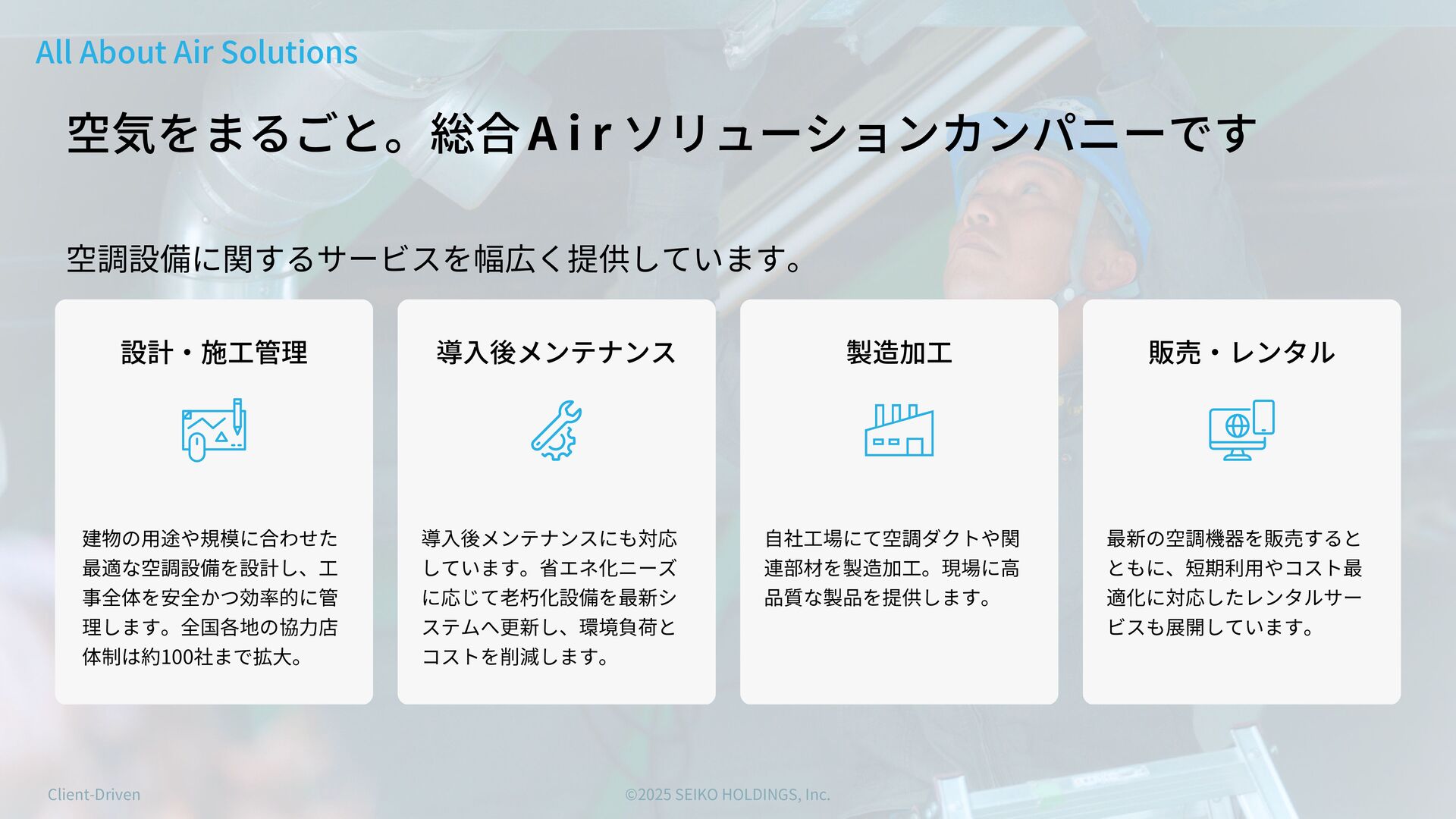 設計・施工管理 導入後メンテナンス 製造加工 販売・レンタル 導入後メンテナンスにも対応 しています。省エネ化ニーズ に応じて老朽化設備を最新シ ステムへ更新し、環境負荷と コストを削減します。 自社工場にて空調ダクトや関 連部材を製造加工。現場に高 品質な製品を提供します。 最新の空調機器を販売すると ともに、短期利用やコスト最 適化に対応したレンタルサー ビスも展開しています。 All About Air Solutions 空調設備に関するサービスを幅広く提供しています。 Client-Driven ©2025 SEIKO HOLDINGS, Inc.