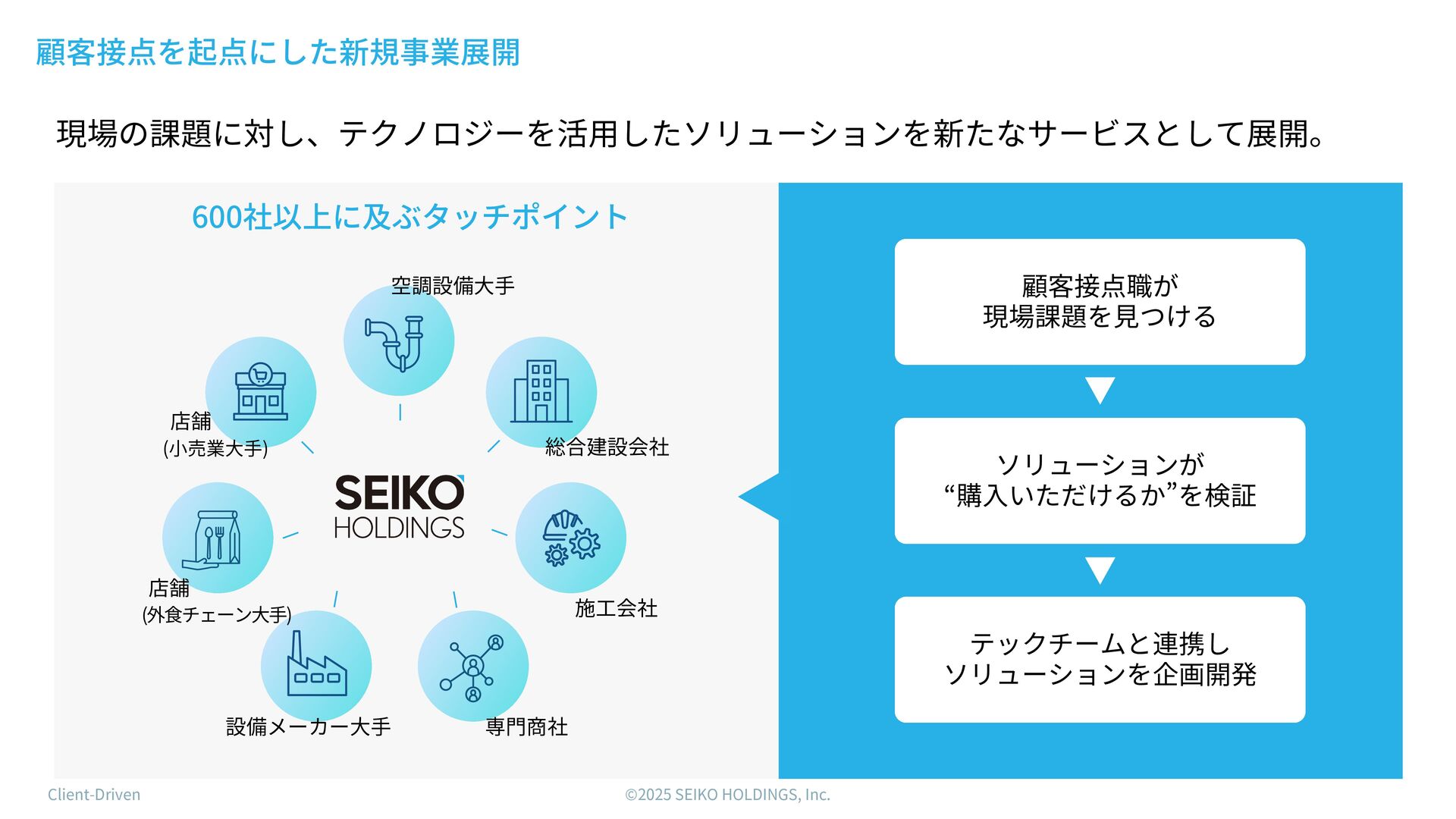顧客接点職が 現場課題を見つける ソリューションが “購入いただけるか”を検証 テックチームと連携し ソリューションを企画開発 600社以上に及ぶタッチポイント 顧客接点を起点にした新規事業展開 Client-Driven ©2025 SEIKO HOLDINGS, Inc.
