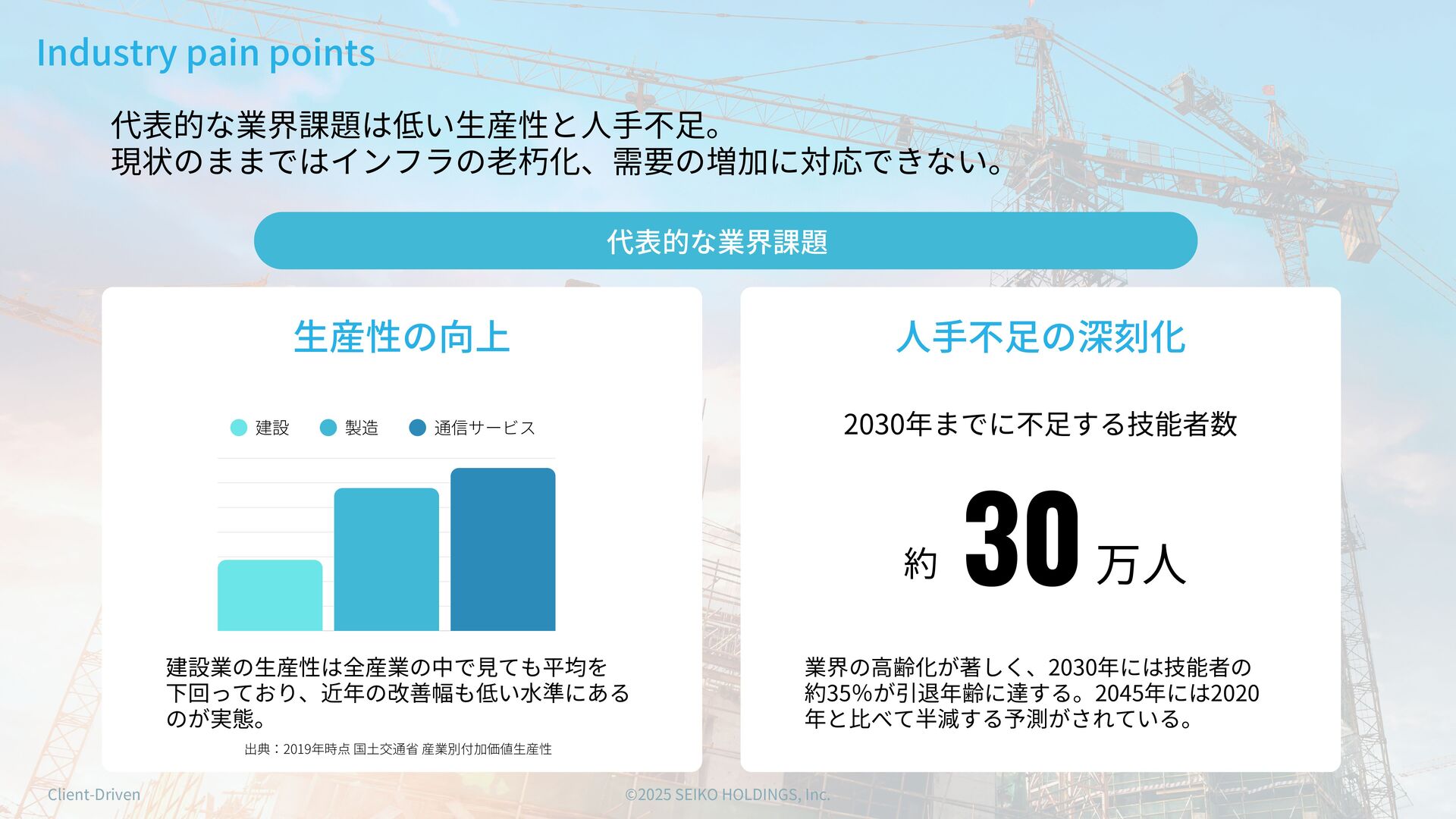 のが実態。 30 2030年までに不足する技能者数 万人 Industry pain points 約 業界の高齢化が著しく、2030年には技能者の 約35%が引退年齢に達する。2045年には2020 年と比べて半減する予測がされている。 出典:2019年時点 国土交通省 産業別付加価値生産性 Client-Driven ©2025 SEIKO HOLDINGS, Inc.