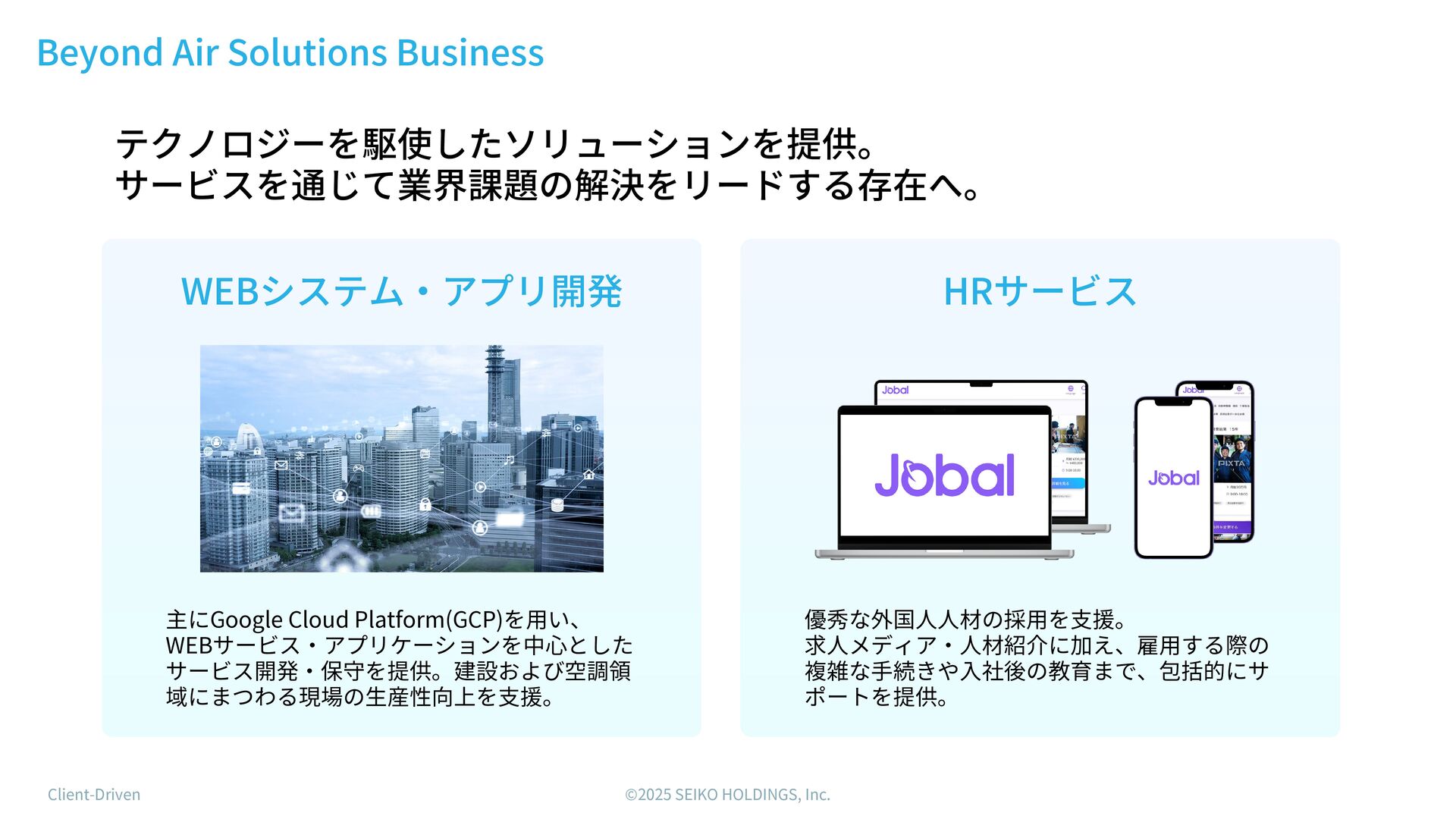 Platform(GCP)を用い、 WEBサービス・アプリケーションを中心とした サービス開発・保守を提供。建設および空調領 域にまつわる現場の生産性向上を支援。 優秀な外国人人材の採用を支援。 求人メディア・人材紹介に加え、雇用する際の 複雑な手続きや入社後の教育まで、包括的にサ ポートを提供。 Client-Driven ©2025 SEIKO HOLDINGS, Inc.