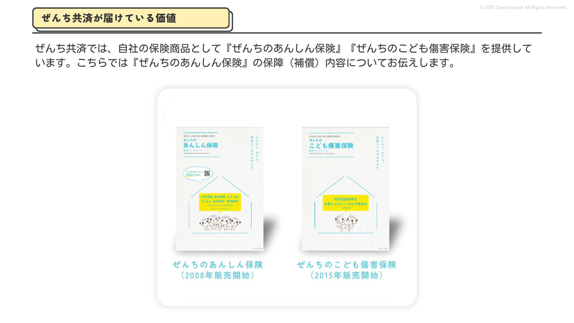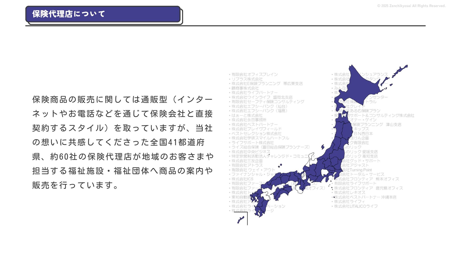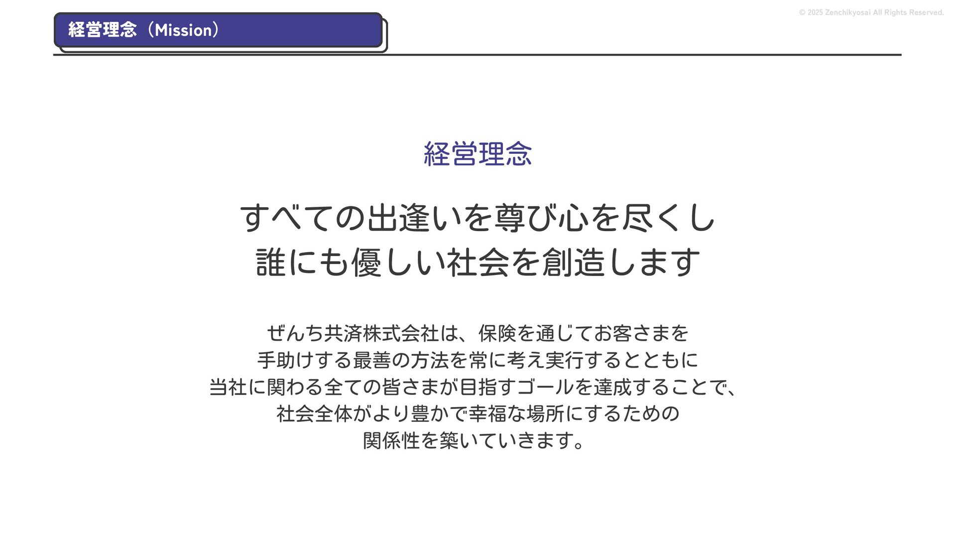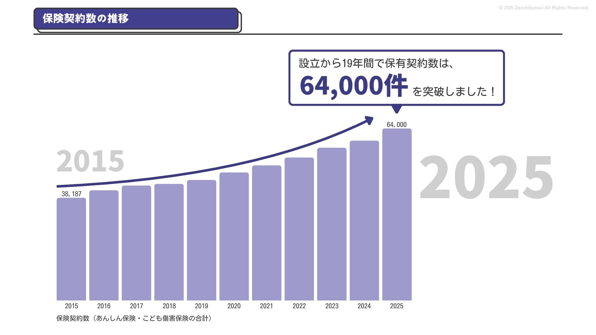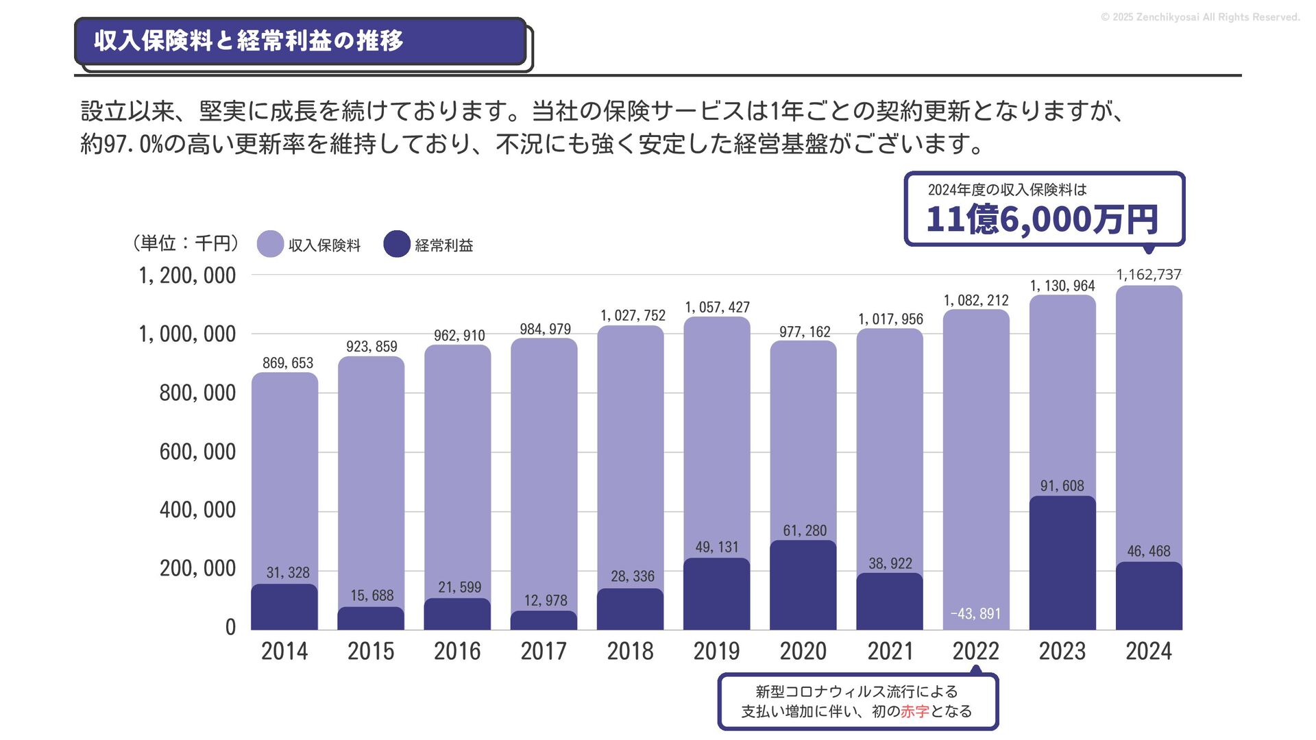 2024 0円 200,000円 400,000円 600,000円 800,000円 1,000,000円 1,200,000円 31,328 15,688 21,599 12,978 28,336 49,131 1,000,000 400,000 800,000 600,000 200,000 0 1,200,000 869,653 923,859 962,910 984,979 1,027,752 1,057,427 977,162 1,017,956 1,082,212 1,130,964 (単位:千円) 38,922 -43,891 91,608 61,280 収入保険料 経常利益 © 2025 Zenchikyosai All Rights Reserved. 収入保険料と経常利益の推移 1,162,737 46,468 設立以来、堅実に成長を続けております。当社の保険サービスは1年ごとの契約更新となりますが、 約97.0%の高い更新率を維持しており、不況にも強く安定した経営基盤がございます。 2024年度の収入保険料は 11億6,000万円 新型コロナウィルス流行による 支払い増加に伴い、初の赤字となる