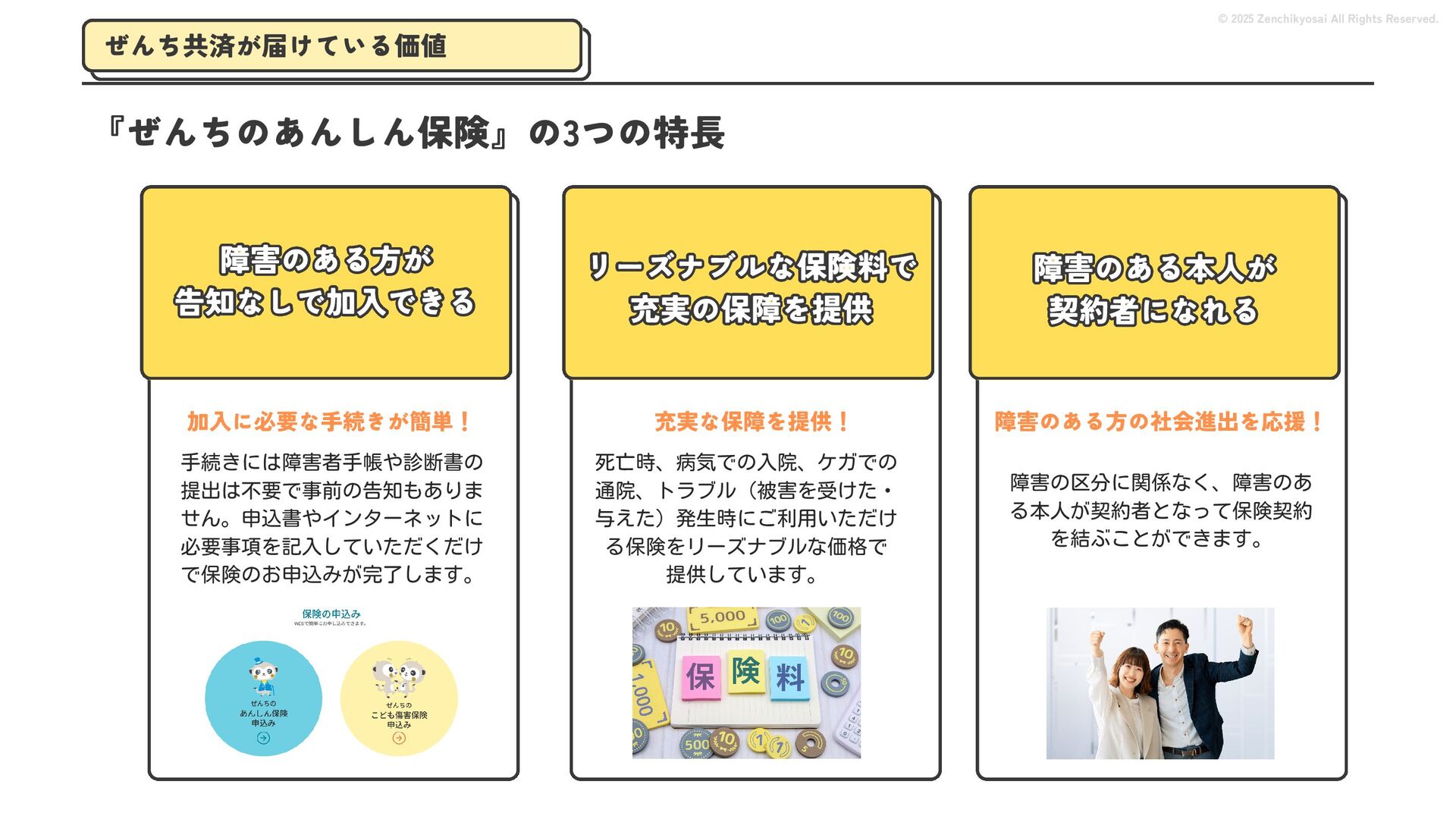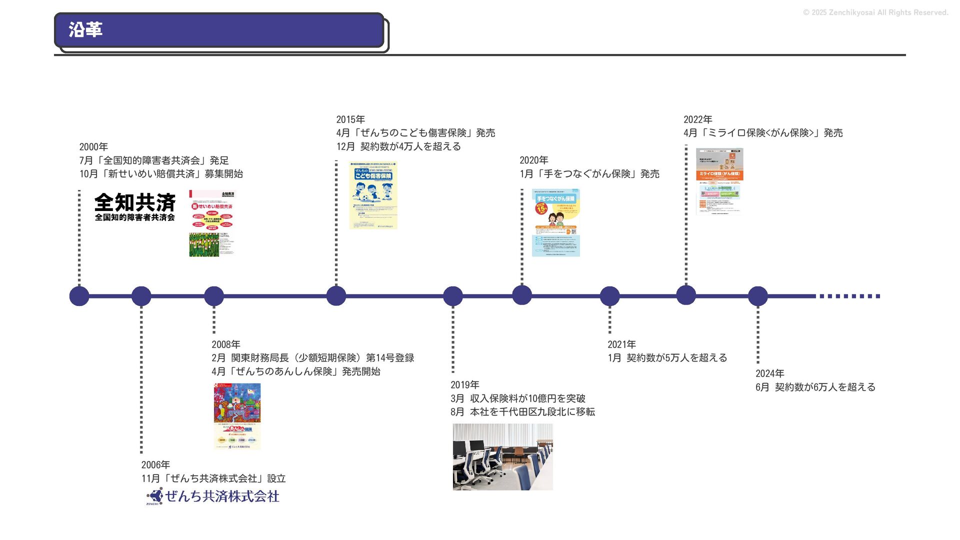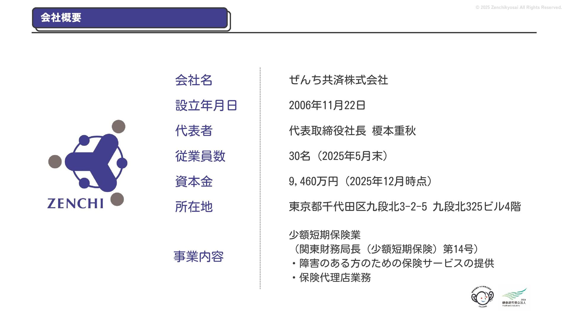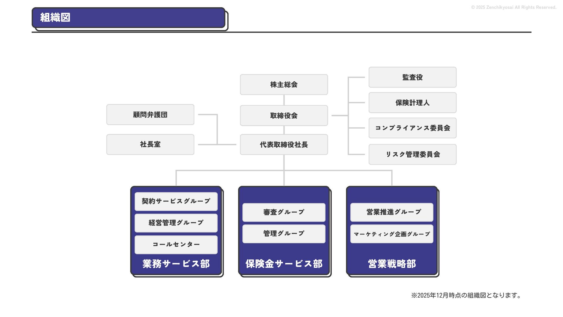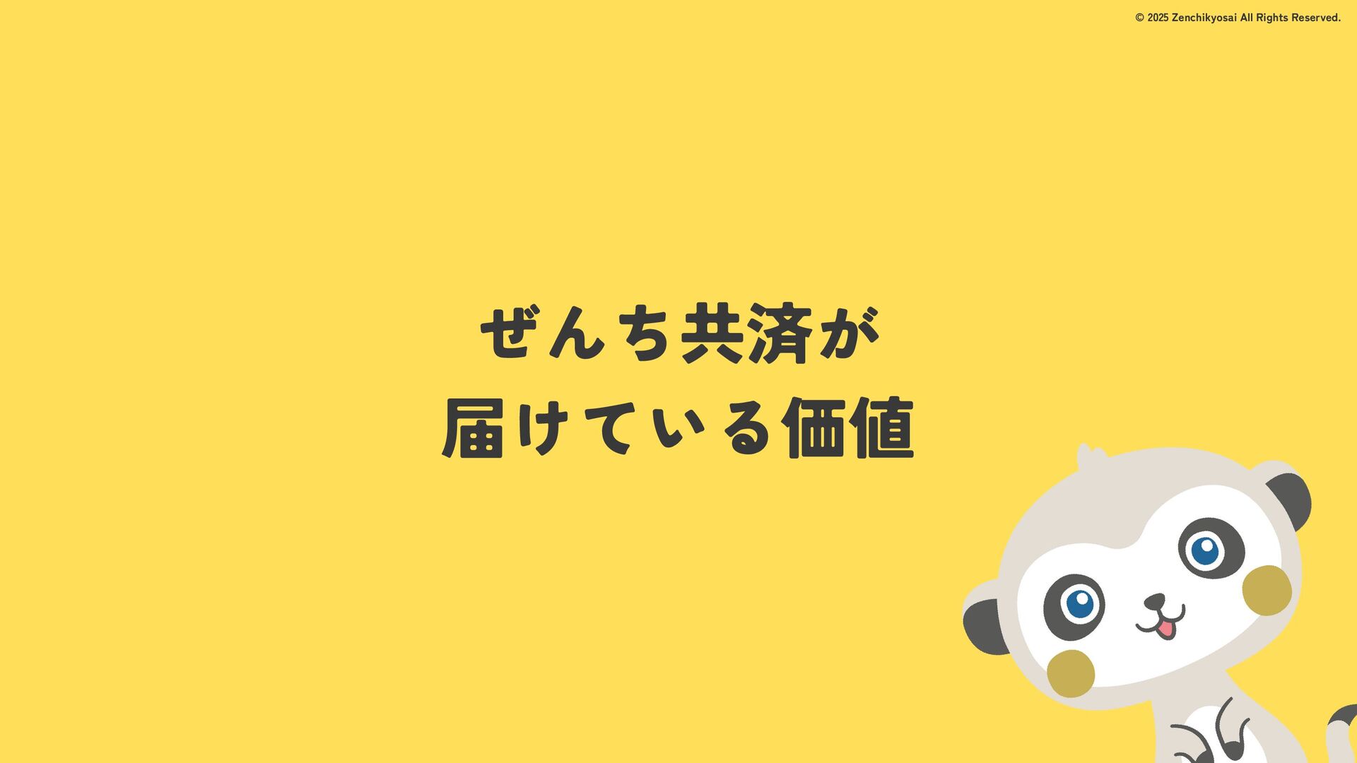 2024 0円 200,000円 400,000円 600,000円 800,000円 1,000,000円 1,200,000円 31,328 15,688 21,599 12,978 28,336 49,131 1,000,000 400,000 800,000 600,000 200,000 0 1,200,000 869,653 923,859 962,910 984,979 1,027,752 1,057,427 977,162 1,017,956 1,082,212 1,130,964 (単位:千円) 38,922 -43,891 91,608 61,280 収入保険料 経常利益 © 2025 Zenchikyosai All Rights Reserved. 収入保険料と経常利益の推移 1,162,737 46,468 設立以来、堅実に成長を続けております。当社の保険サービスは1年ごとの契約更新となりますが、 約97.0%の高い更新率を維持しており、不況にも強く安定した経営基盤がございます。 2024年度の収入保険料は 11億6,000万円 新型コロナウィルス流行による 支払い増加に伴い、初の赤字となる