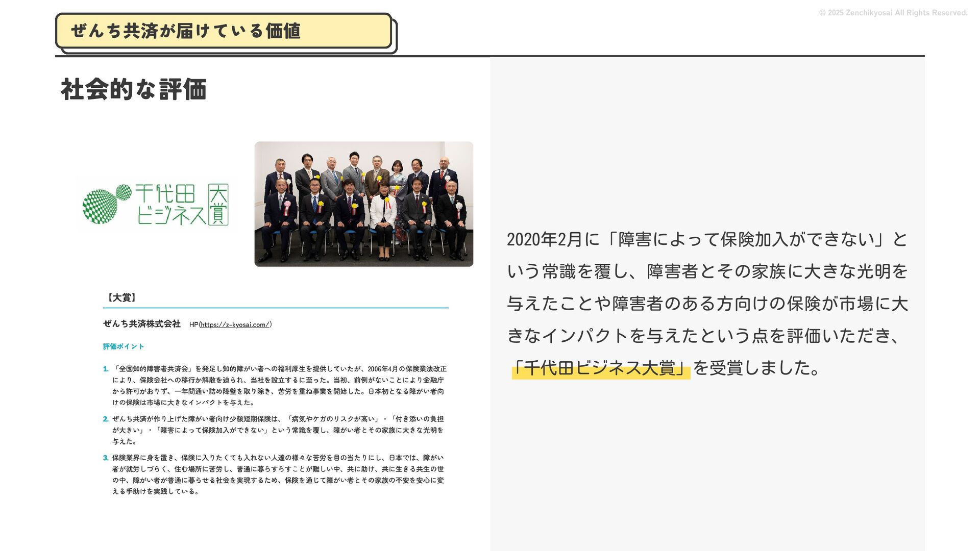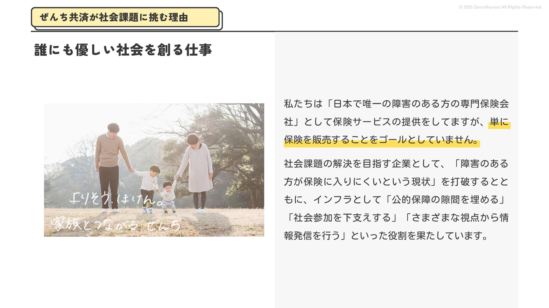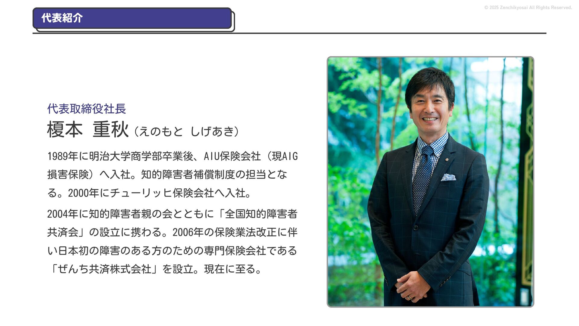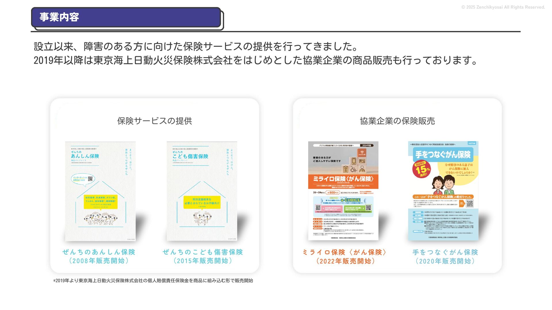 2024 0円 200,000円 400,000円 600,000円 800,000円 1,000,000円 1,200,000円 31,328 15,688 21,599 12,978 28,336 49,131 1,000,000 400,000 800,000 600,000 200,000 0 1,200,000 869,653 923,859 962,910 984,979 1,027,752 1,057,427 977,162 1,017,956 1,082,212 1,130,964 (単位:千円) 38,922 -43,891 91,608 61,280 収入保険料 経常利益 © 2025 Zenchikyosai All Rights Reserved. 収入保険料と経常利益の推移 1,162,737 46,468 設立以来、堅実に成長を続けております。当社の保険サービスは1年ごとの契約更新となりますが、 約97.0%の高い更新率を維持しており、不況にも強く安定した経営基盤がございます。 2024年度の収入保険料は 11億6,000万円 新型コロナウィルス流行による 支払い増加に伴い、初の赤字となる