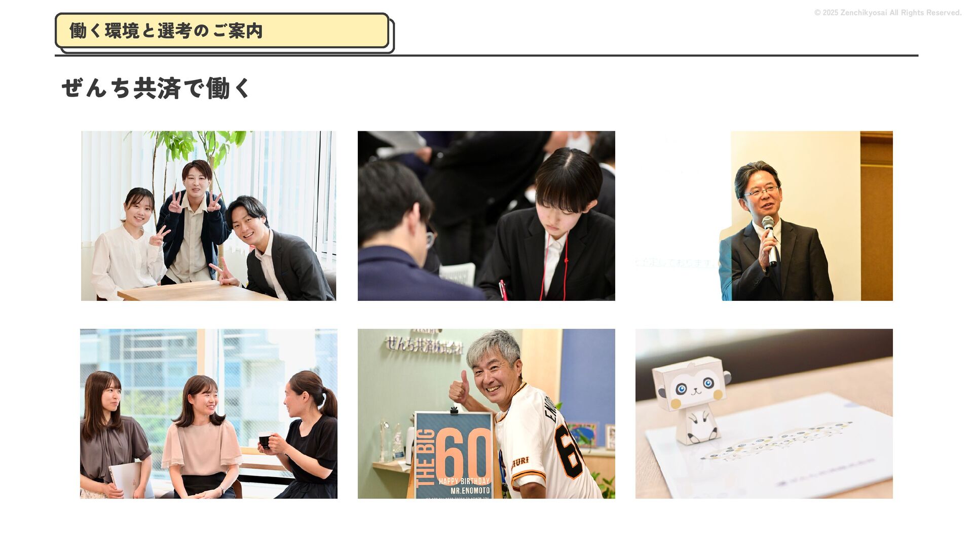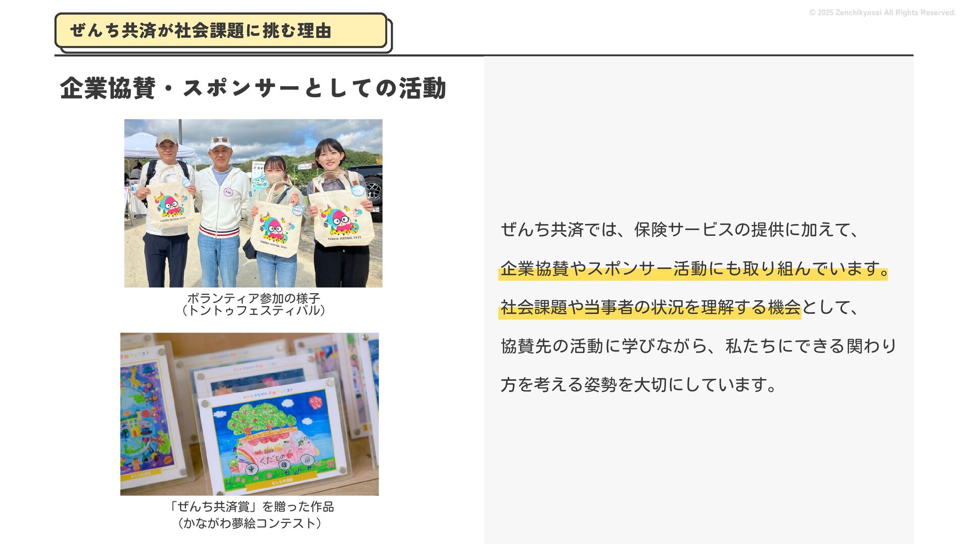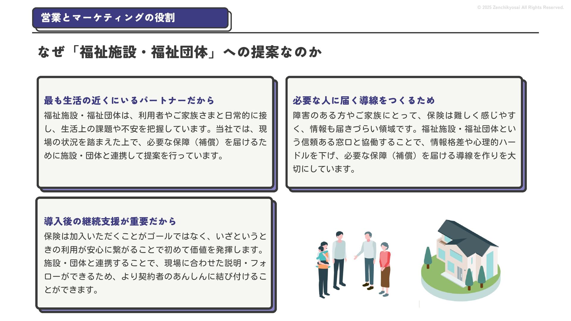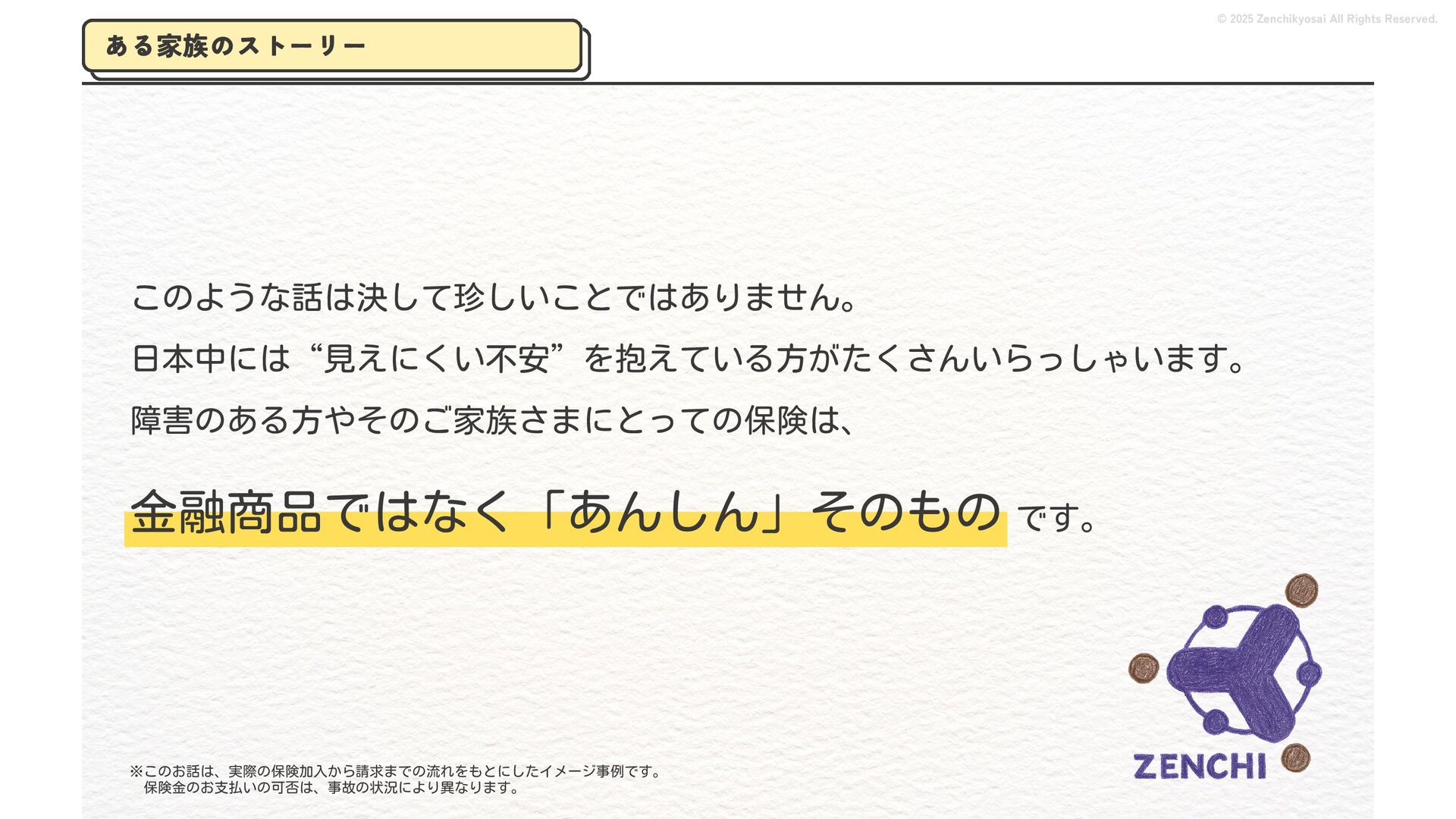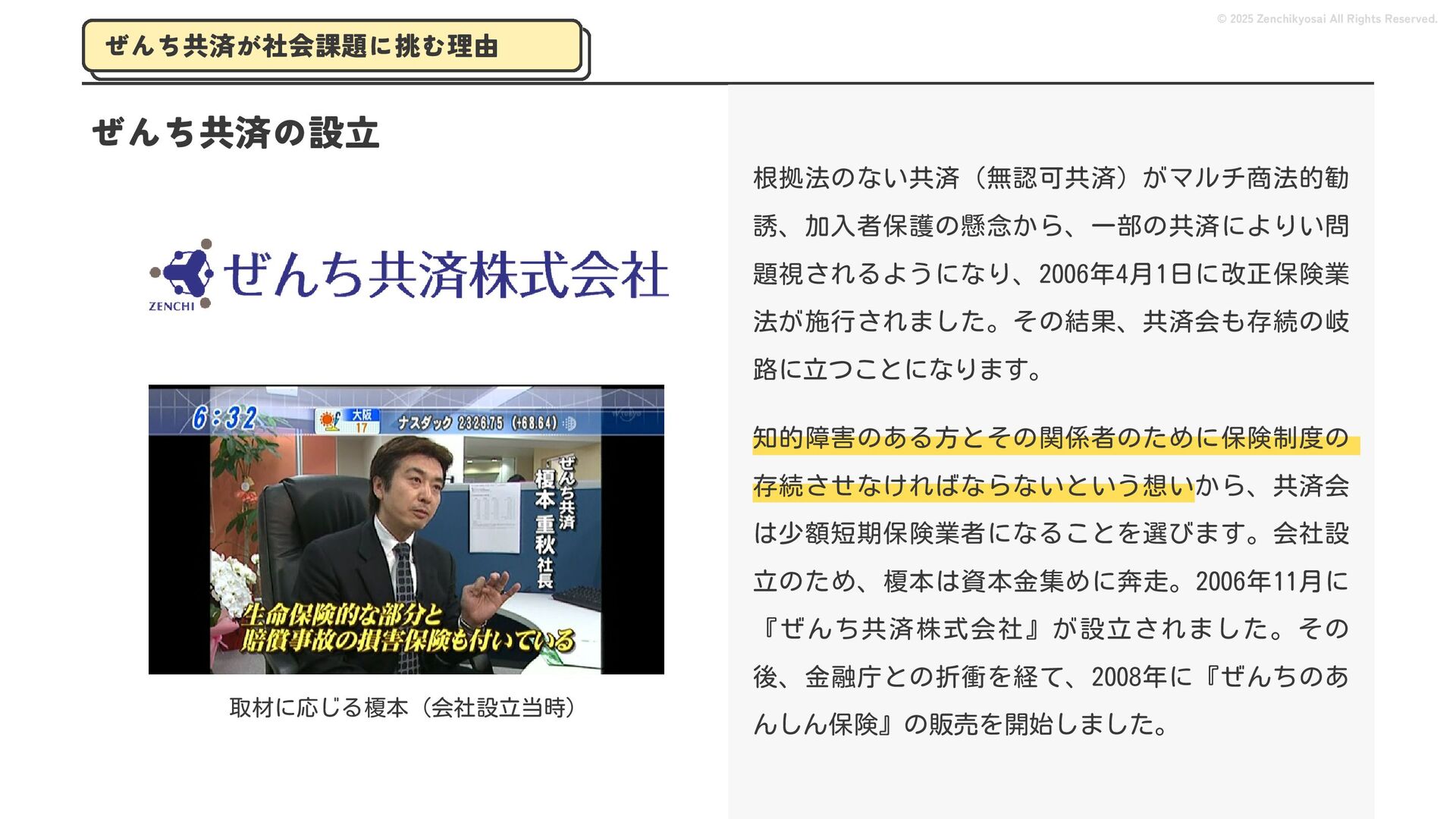 2024 0円 200,000円 400,000円 600,000円 800,000円 1,000,000円 1,200,000円 31,328 15,688 21,599 12,978 28,336 49,131 1,000,000 400,000 800,000 600,000 200,000 0 1,200,000 869,653 923,859 962,910 984,979 1,027,752 1,057,427 977,162 1,017,956 1,082,212 1,130,964 (単位:千円) 38,922 -43,891 91,608 61,280 収入保険料 経常利益 © 2025 Zenchikyosai All Rights Reserved. 収入保険料と経常利益の推移 1,162,737 46,468 設立以来、堅実に成長を続けております。当社の保険サービスは1年ごとの契約更新となりますが、 約97.0%の高い更新率を維持しており、不況にも強く安定した経営基盤がございます。 2024年度の収入保険料は 11億6,000万円 新型コロナウィルス流行による 支払い増加に伴い、初の赤字となる