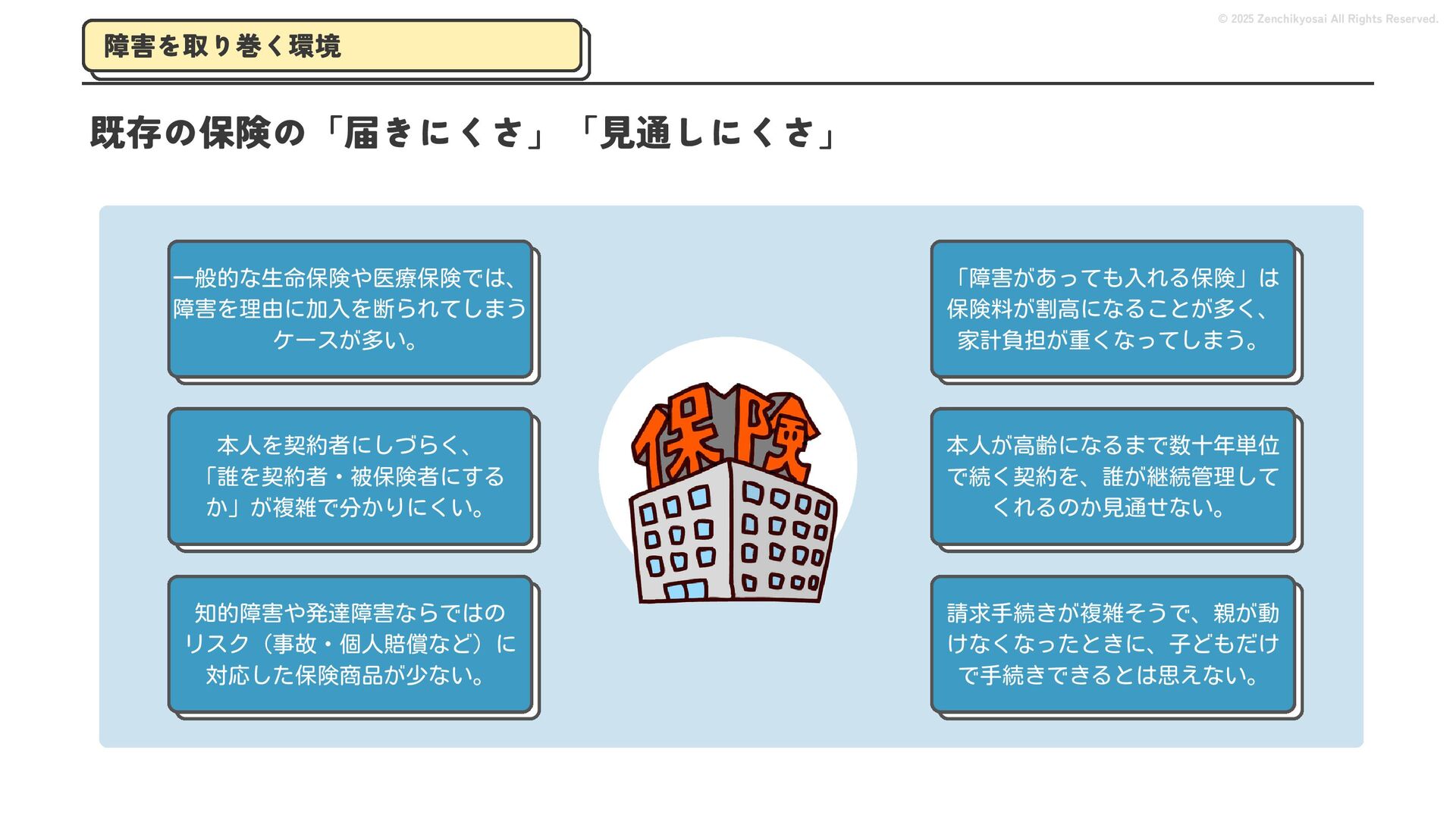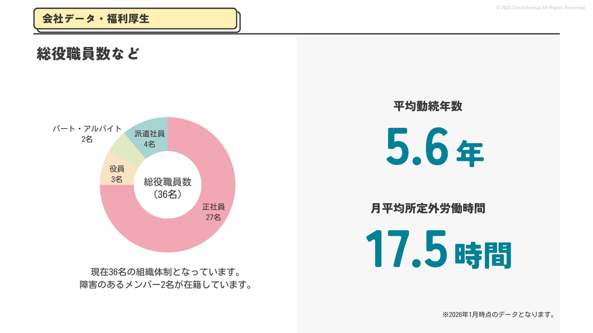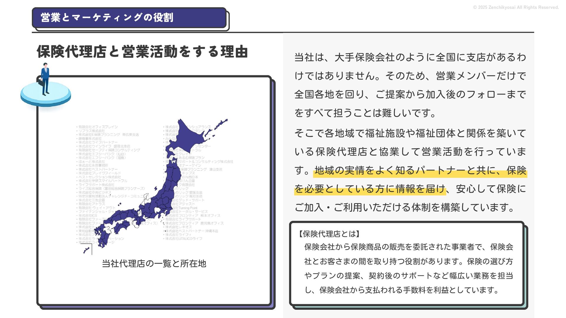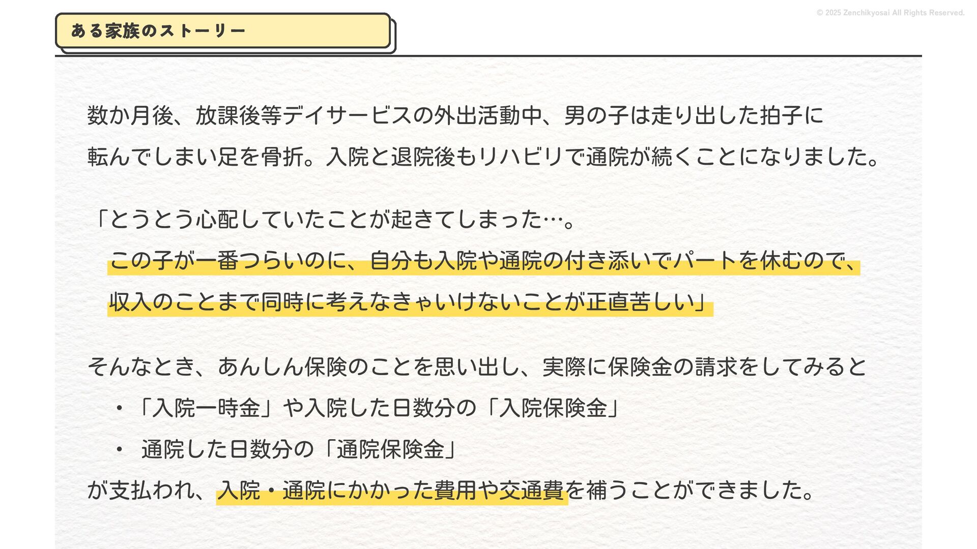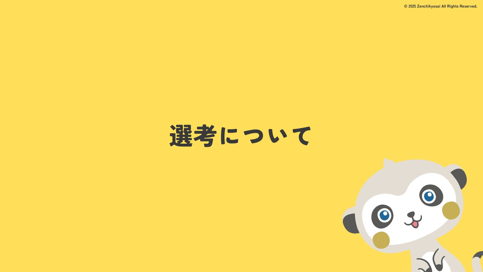2024 0円 200,000円 400,000円 600,000円 800,000円 1,000,000円 1,200,000円 31,328 15,688 21,599 12,978 28,336 49,131 1,000,000 400,000 800,000 600,000 200,000 0 1,200,000 869,653 923,859 962,910 984,979 1,027,752 1,057,427 977,162 1,017,956 1,082,212 1,130,964 (単位:千円) 38,922 -43,891 91,608 61,280 収入保険料 経常利益 © 2025 Zenchikyosai All Rights Reserved. 収入保険料と経常利益の推移 1,162,737 46,468 設立以来、堅実に成長を続けております。当社の保険サービスは1年ごとの契約更新となりますが、 約97.0%の高い更新率を維持しており、不況にも強く安定した経営基盤がございます。 2024年度の収入保険料は 11億6,000万円 新型コロナウィルス流行による 支払い増加に伴い、初の赤字となる