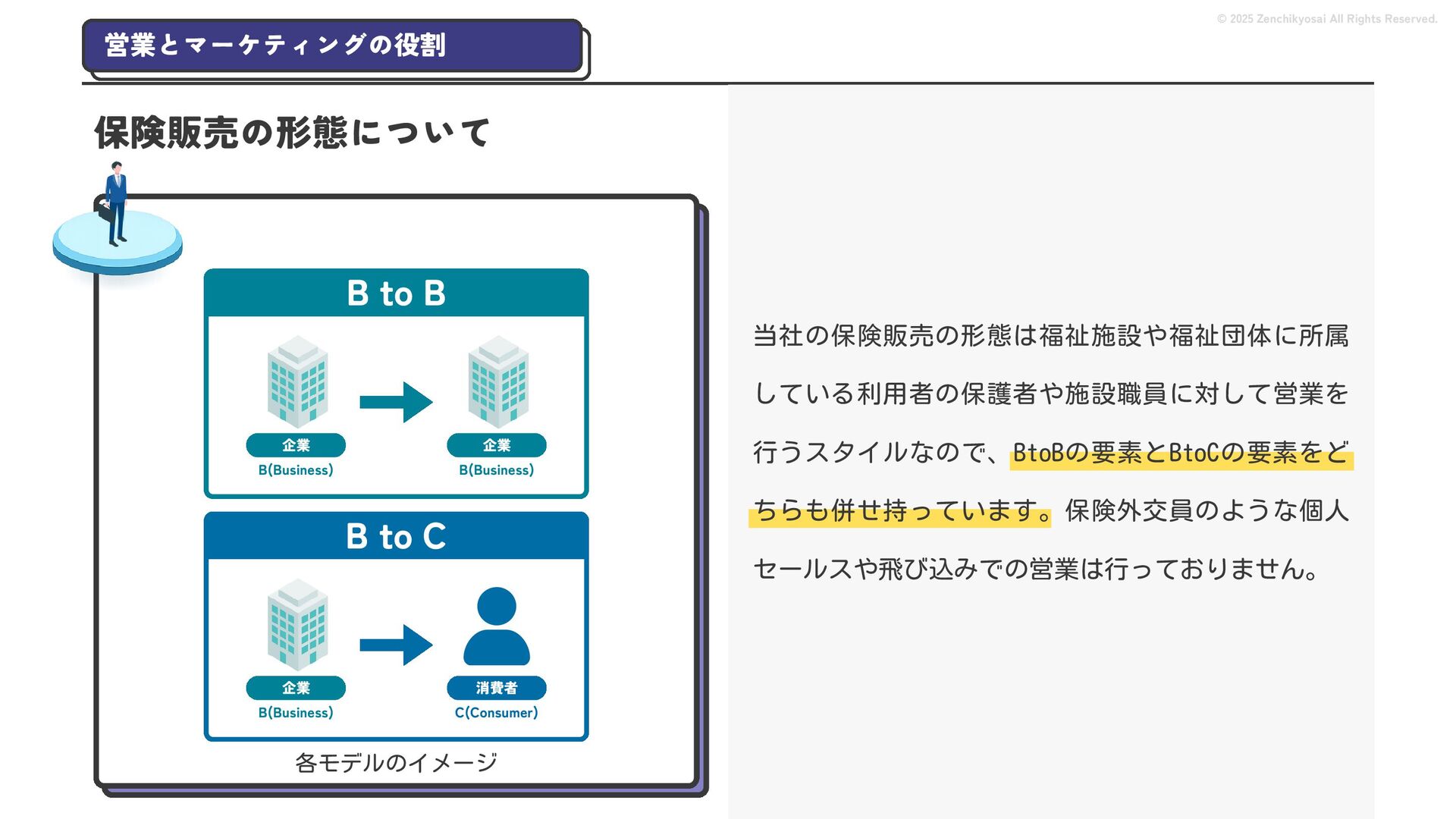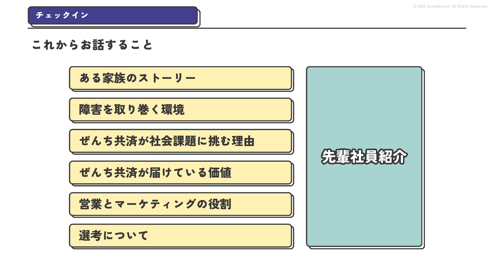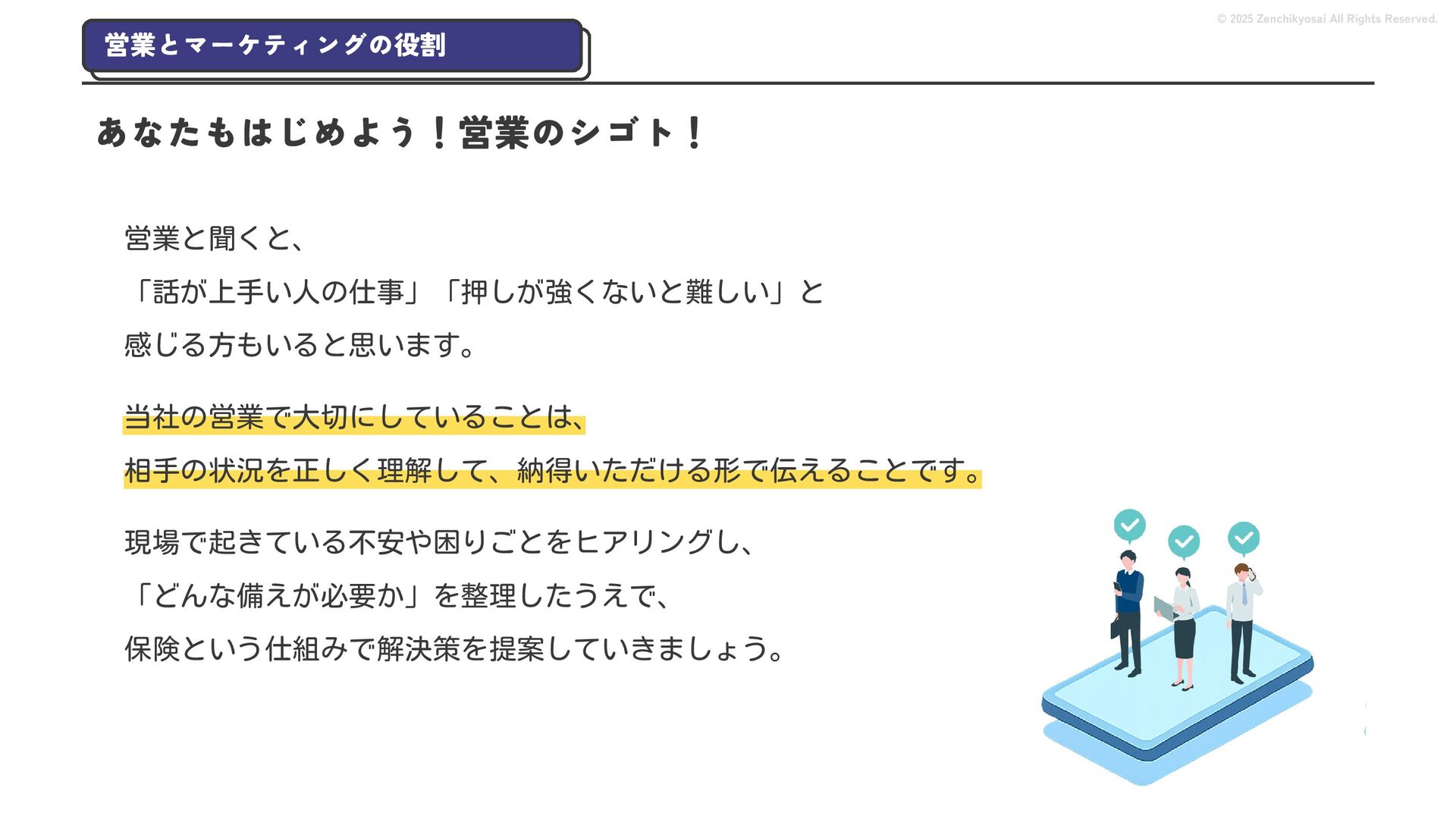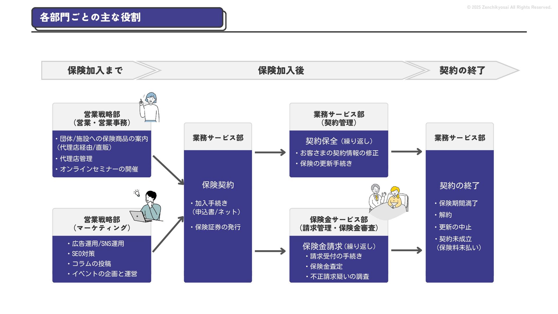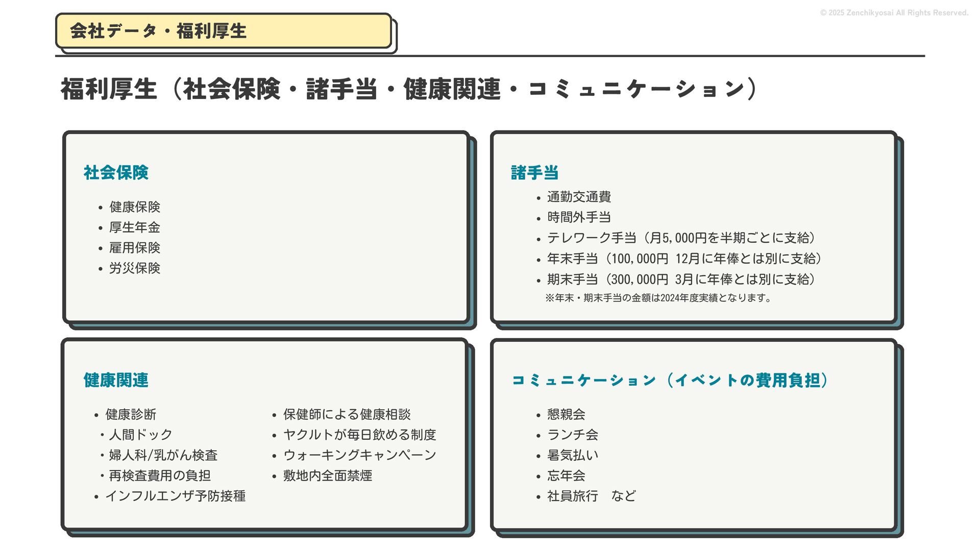 2024 0円 200,000円 400,000円 600,000円 800,000円 1,000,000円 1,200,000円 31,328 15,688 21,599 12,978 28,336 49,131 1,000,000 400,000 800,000 600,000 200,000 0 1,200,000 869,653 923,859 962,910 984,979 1,027,752 1,057,427 977,162 1,017,956 1,082,212 1,130,964 (単位:千円) 38,922 -43,891 91,608 61,280 収入保険料 経常利益 © 2025 Zenchikyosai All Rights Reserved. 収入保険料と経常利益の推移 1,162,737 46,468 設立以来、堅実に成長を続けております。当社の保険サービスは1年ごとの契約更新となりますが、 約97.0%の高い更新率を維持しており、不況にも強く安定した経営基盤がございます。 2024年度の収入保険料は 11億6,000万円 新型コロナウィルス流行による 支払い増加に伴い、初の赤字となる