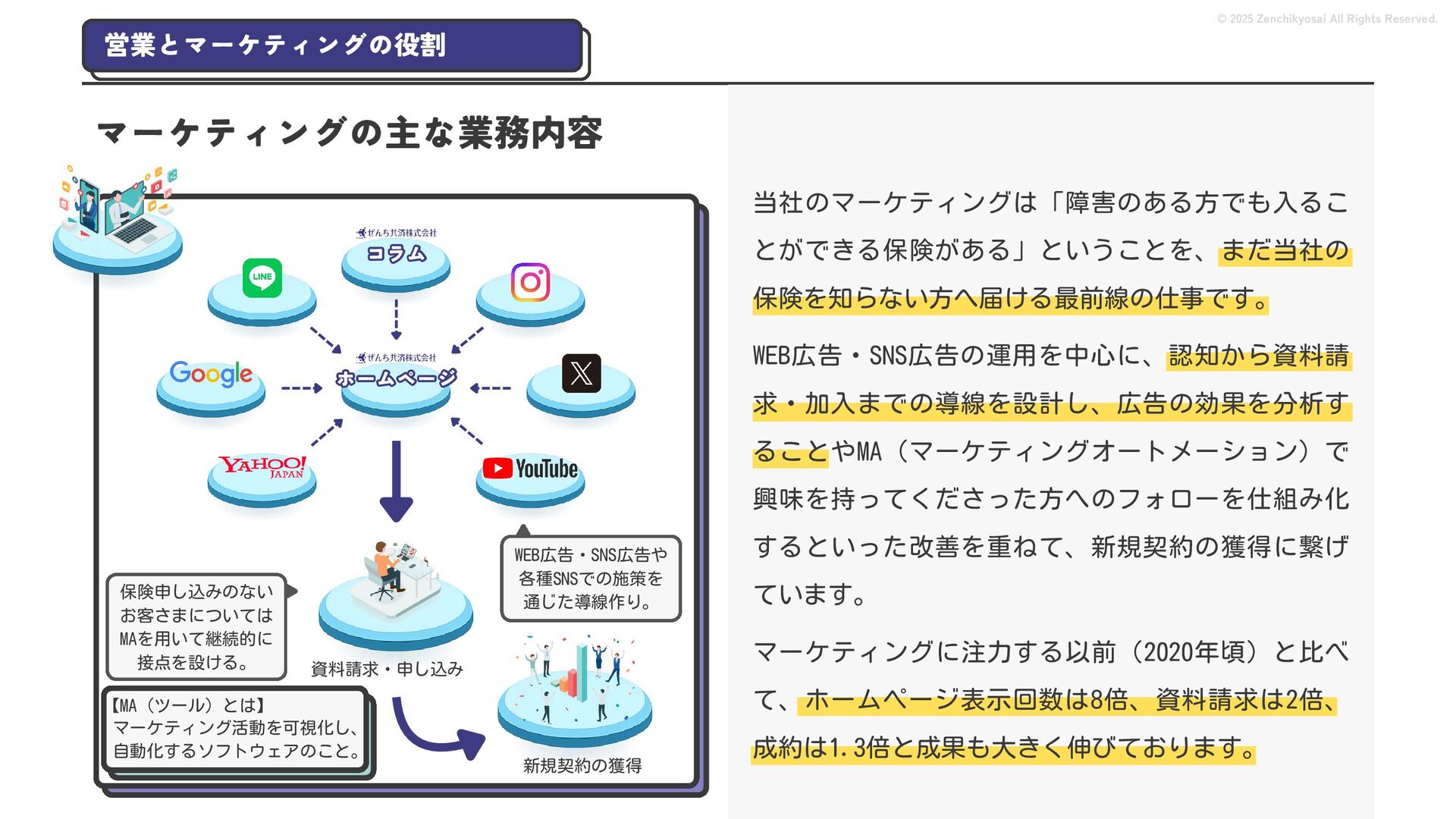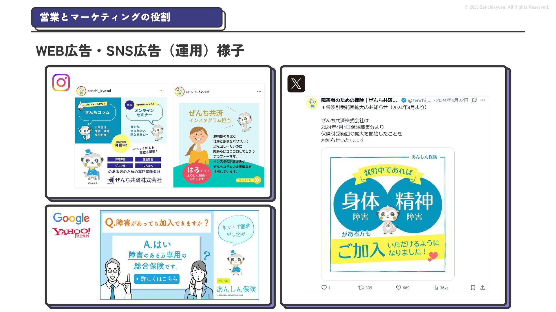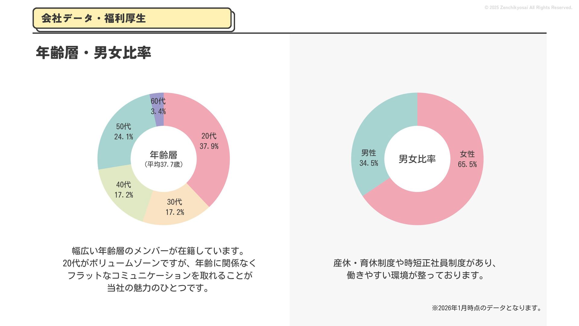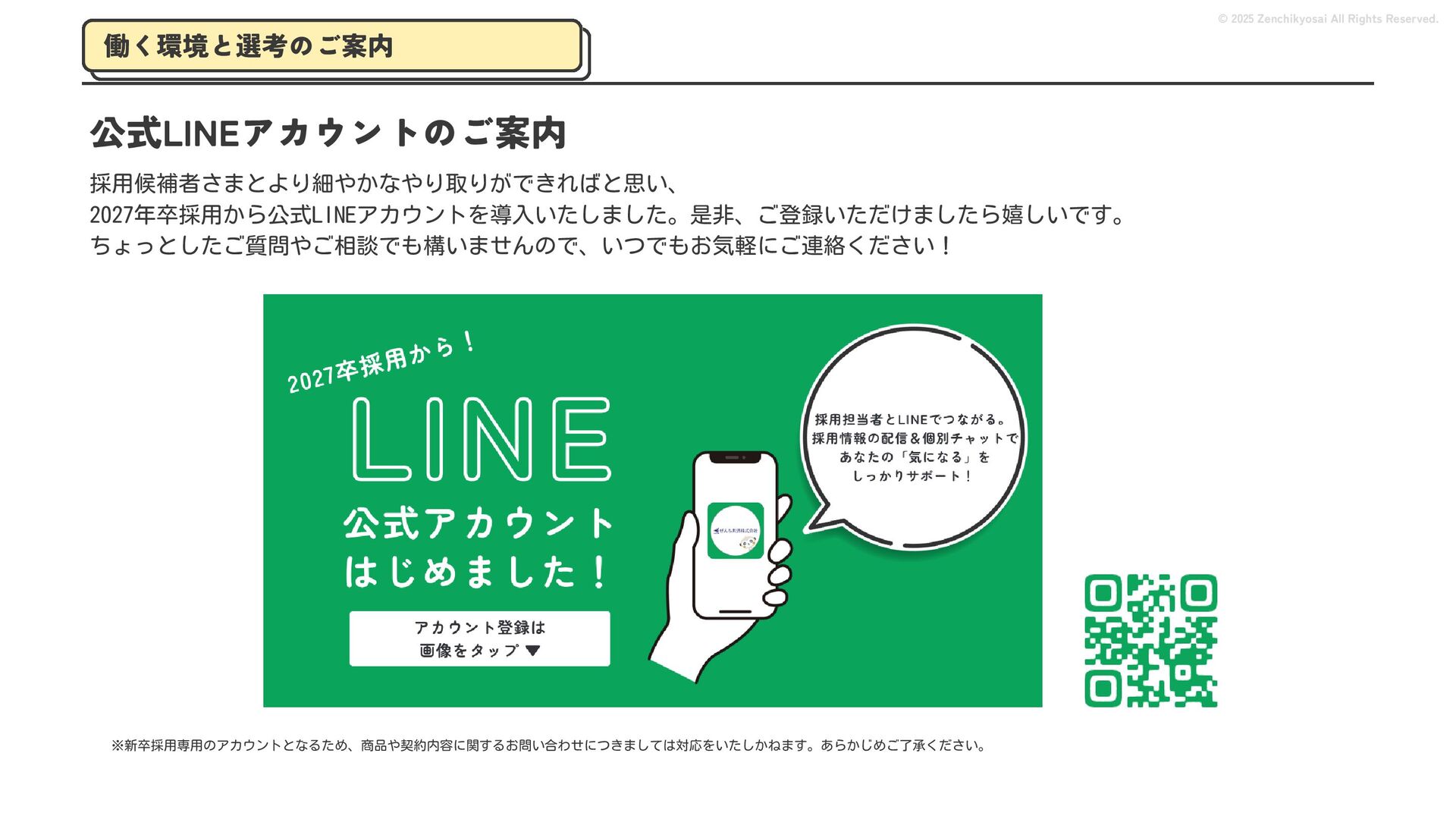 2024 0円 200,000円 400,000円 600,000円 800,000円 1,000,000円 1,200,000円 31,328 15,688 21,599 12,978 28,336 49,131 1,000,000 400,000 800,000 600,000 200,000 0 1,200,000 869,653 923,859 962,910 984,979 1,027,752 1,057,427 977,162 1,017,956 1,082,212 1,130,964 (単位:千円) 38,922 -43,891 91,608 61,280 収入保険料 経常利益 © 2025 Zenchikyosai All Rights Reserved. 収入保険料と経常利益の推移 1,162,737 46,468 設立以来、堅実に成長を続けております。当社の保険サービスは1年ごとの契約更新となりますが、 約97.0%の高い更新率を維持しており、不況にも強く安定した経営基盤がございます。 2024年度の収入保険料は 11億6,000万円 新型コロナウィルス流行による 支払い増加に伴い、初の赤字となる