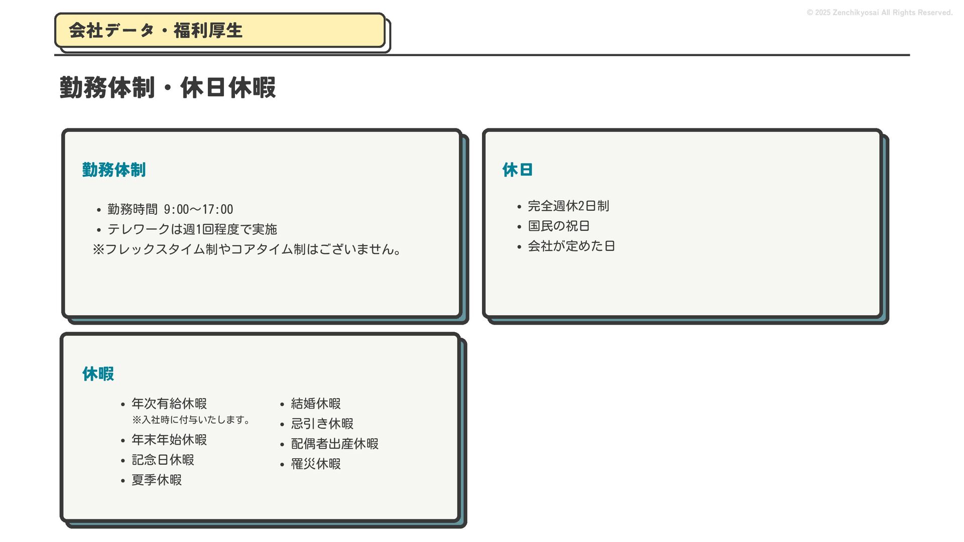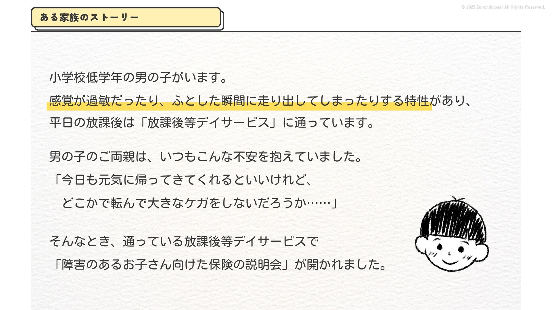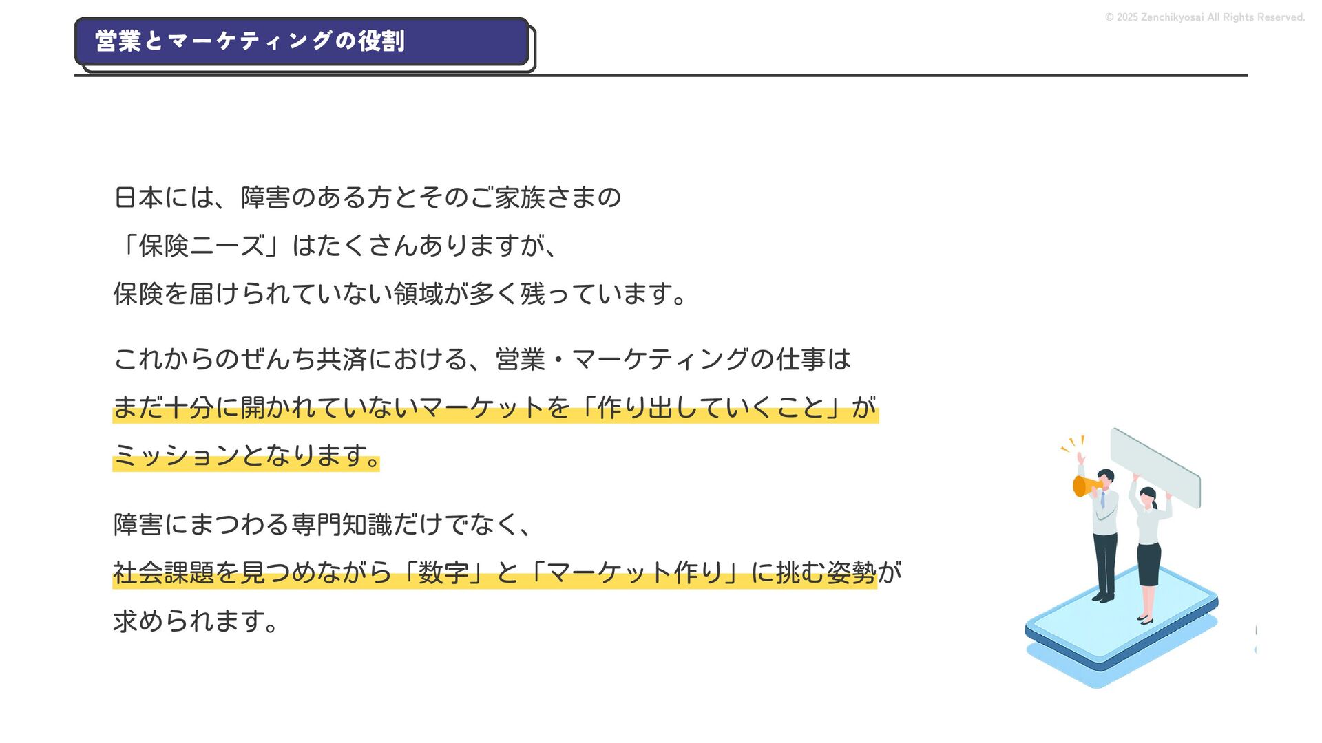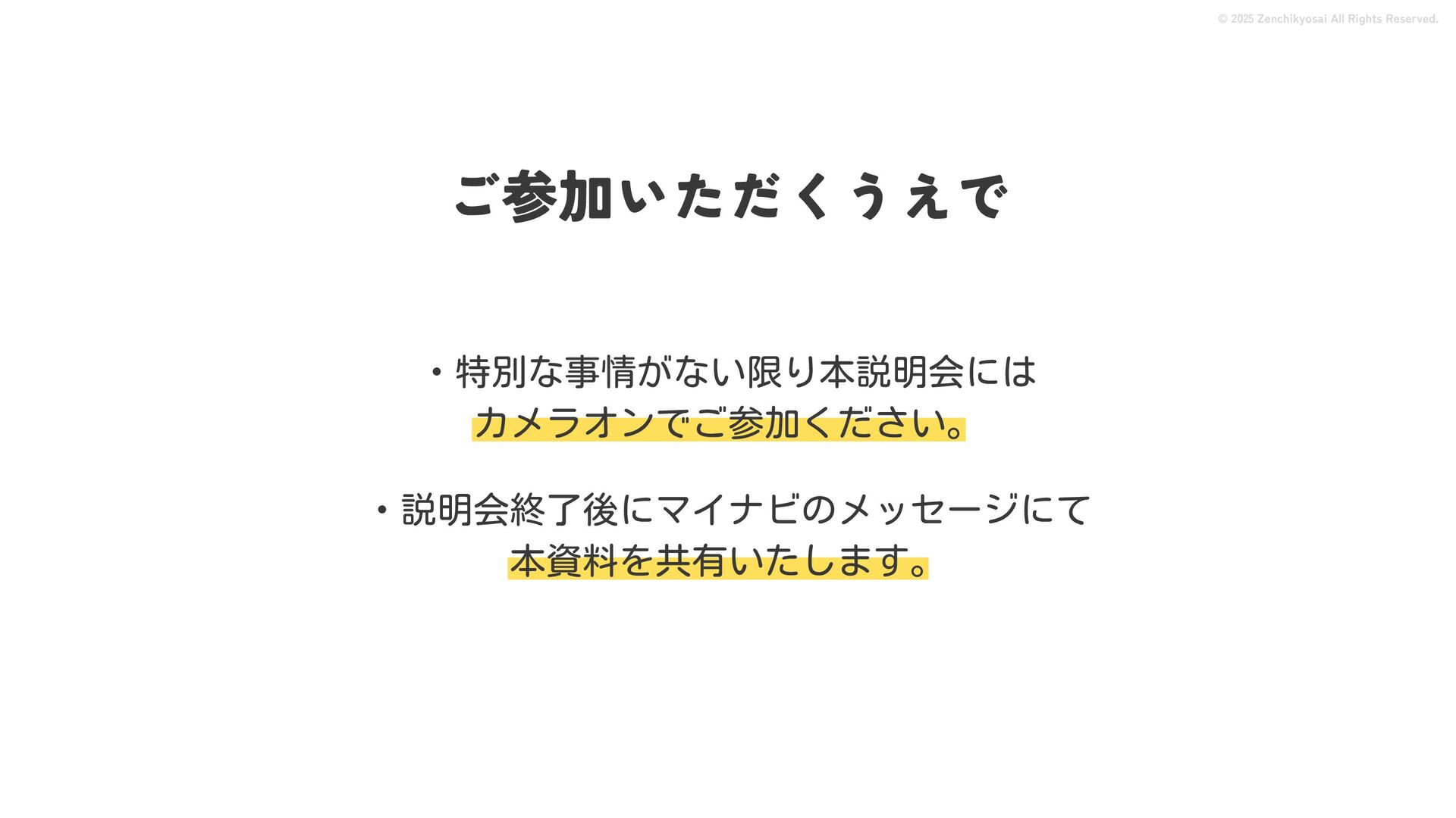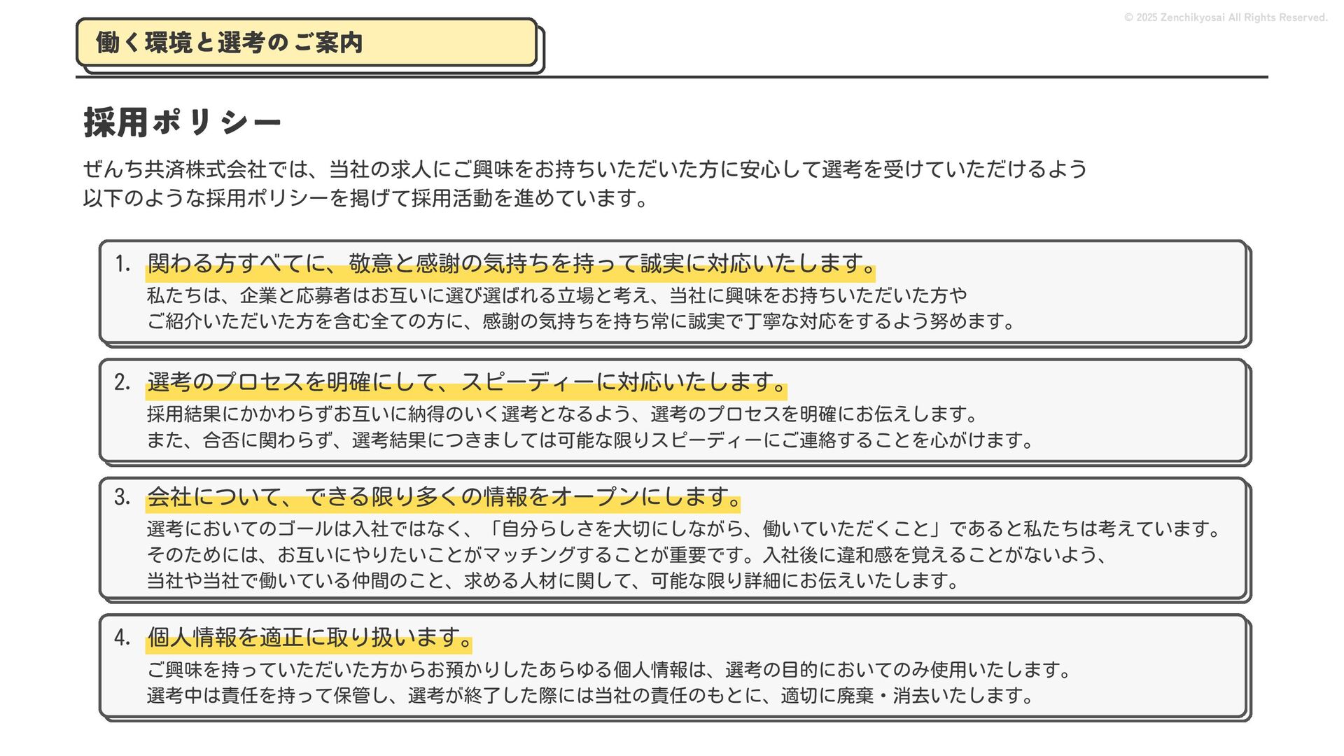 2024 0円 200,000円 400,000円 600,000円 800,000円 1,000,000円 1,200,000円 31,328 15,688 21,599 12,978 28,336 49,131 1,000,000 400,000 800,000 600,000 200,000 0 1,200,000 869,653 923,859 962,910 984,979 1,027,752 1,057,427 977,162 1,017,956 1,082,212 1,130,964 (単位:千円) 38,922 -43,891 91,608 61,280 収入保険料 経常利益 © 2025 Zenchikyosai All Rights Reserved. 収入保険料と経常利益の推移 1,162,737 46,468 設立以来、堅実に成長を続けております。当社の保険サービスは1年ごとの契約更新となりますが、 約97.0%の高い更新率を維持しており、不況にも強く安定した経営基盤がございます。 2024年度の収入保険料は 11億6,000万円 新型コロナウィルス流行による 支払い増加に伴い、初の赤字となる