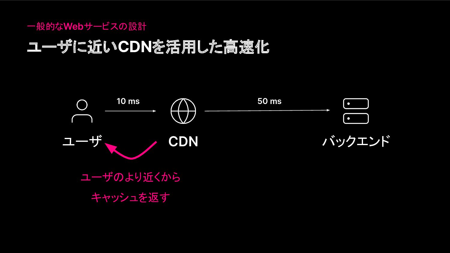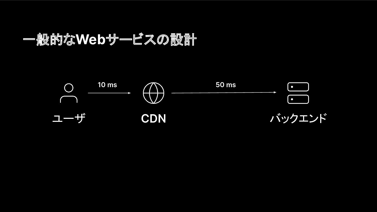 一般的なWebサービスの設計 ユーザ CDN バックエンド 10 ms 50 ms