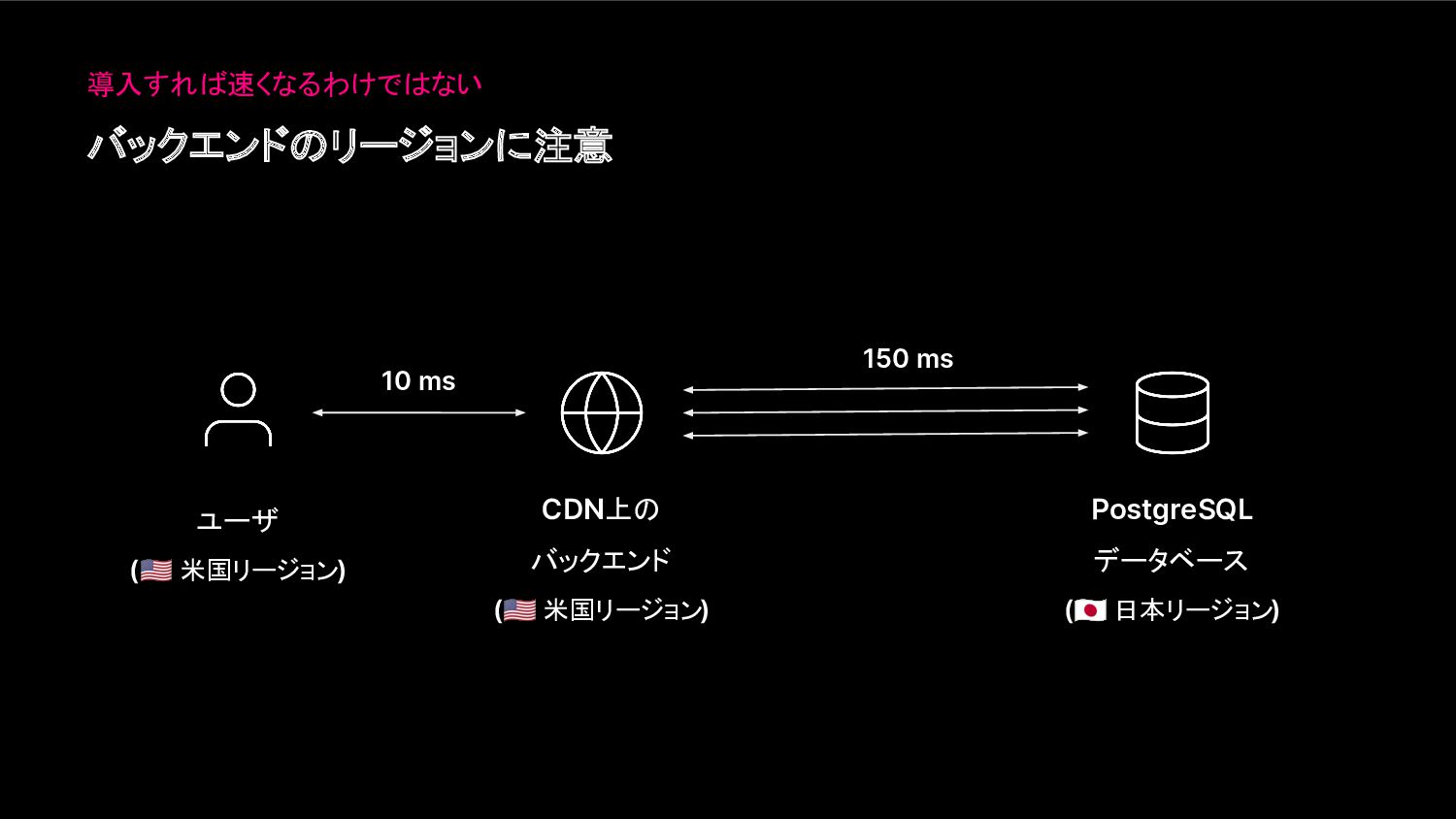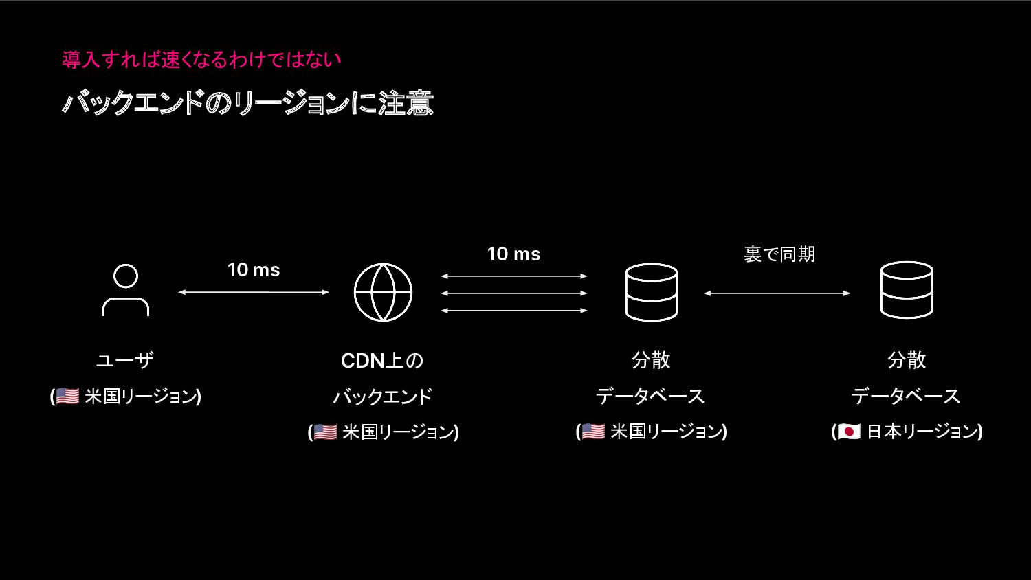 バックエンドのリージョンに注意 10 ms ユーザ ( 米国リージョン) CDN上の バックエンド ( 米国リージョン)