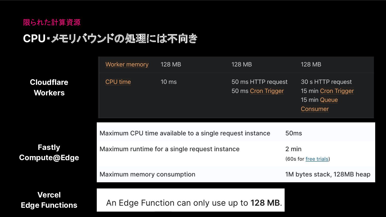 CPU・メモリバウンドの処理には不向き 限られた計算資源 Cloudflare Workers Fastly Compute@Edge Vercel Edge Functions