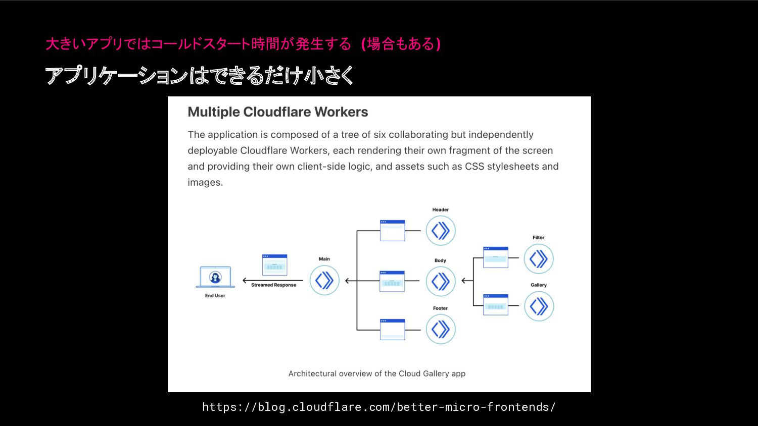 アプリケーションはできるだけ小さく 大きいアプリではコールドスタート時間が発生する (場合もある) https://blog.cloudflare.com/better-micro-frontends/