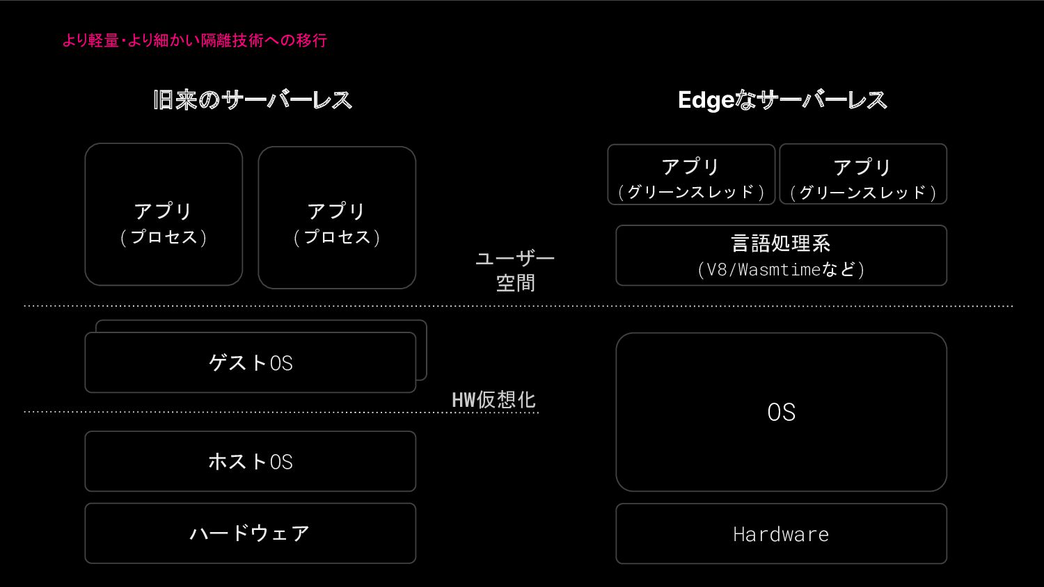 旧来のサーバーレス Edgeなサーバーレス Ser ハードウェア Ser ホストOS Ser Hardware アプリ (プロセス)