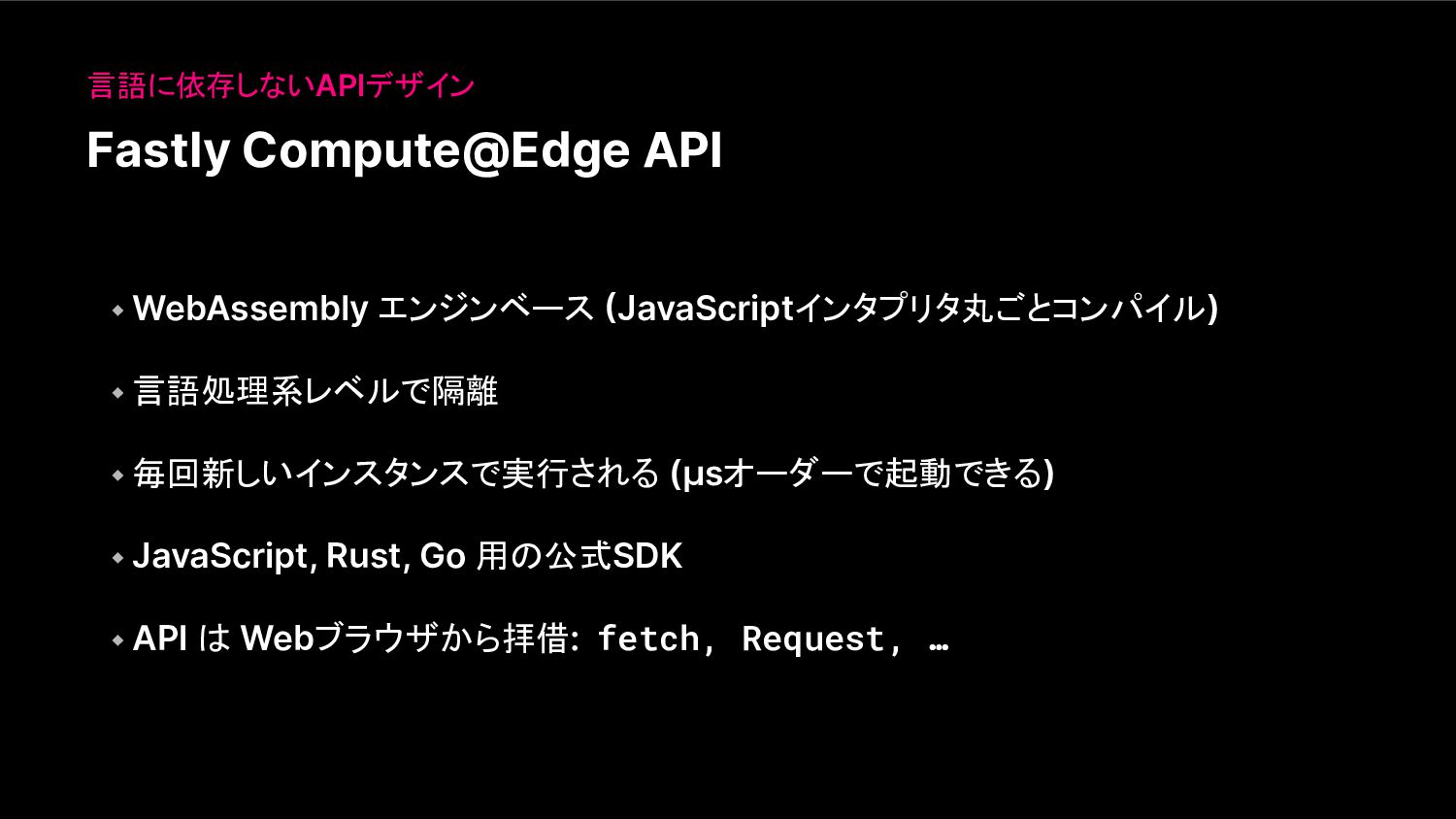 Fastly Compute@Edge API 言語に依存しないAPIデザイン ⬩ WebAssembly エンジンベース (JavaScriptインタプリタ丸ごとコンパイル) ⬩ 言語処理系レベルで隔離