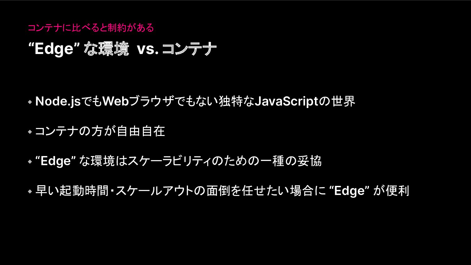 “Edge” な環境 vs. コンテナ コンテナに比べると制約がある ⬩ Node.jsでもWebブラウザでもない独特なJavaScriptの世界 ⬩ コンテナの方が自由自在 ⬩