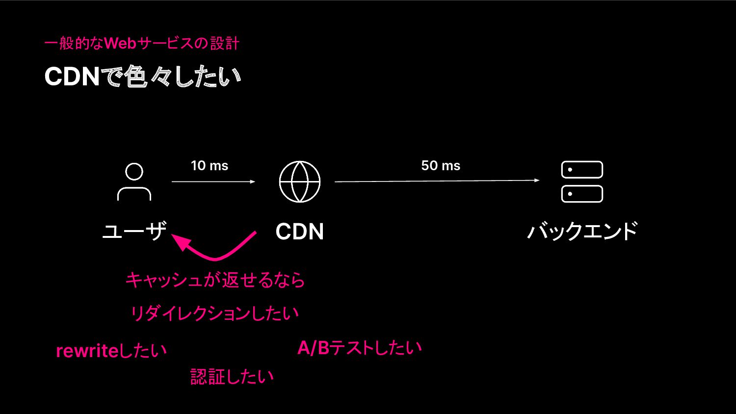CDNで色々したい ユーザ CDN バックエンド 10 ms キャッシュが返せるなら リダイレクションしたい A/Bテストしたい 認証したい