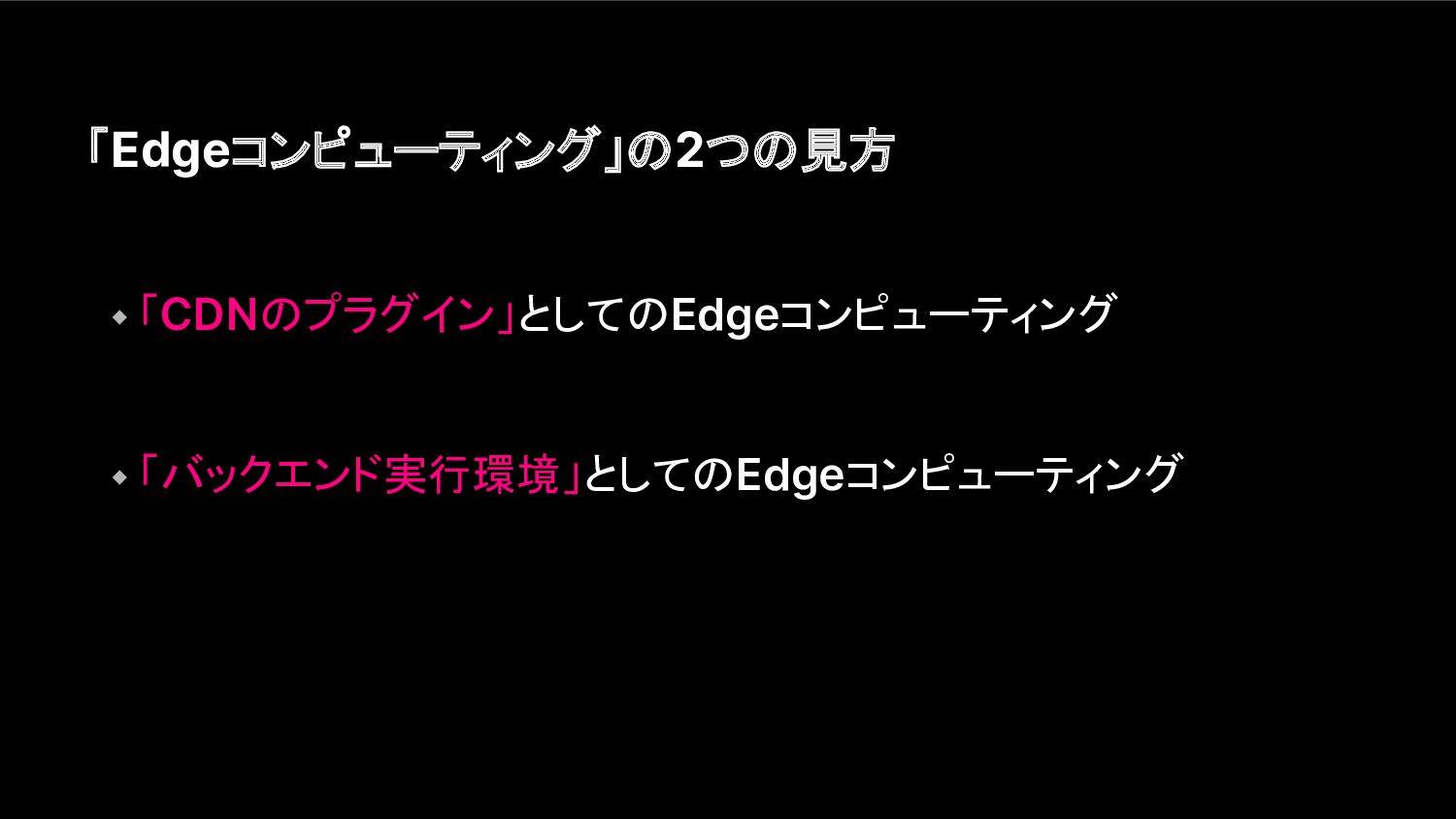 「Edgeコンピューティング」の2つの見方 ⬩ 「CDNのプラグイン」としてのEdgeコンピューティング ⬩ 「バックエンド実行環境」としてのEdgeコンピューティング