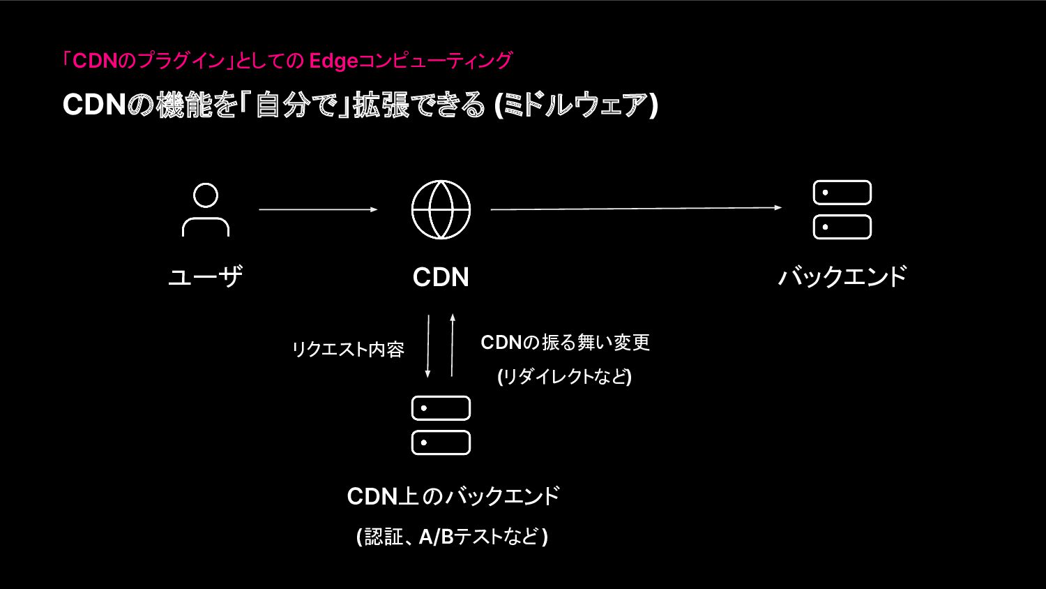 CDNの機能を「自分で」拡張できる (ミドルウェア) 「CDNのプラグイン」としての Edgeコンピューティング ユーザ CDN CDN上のバックエンド (認証、A/Bテストなど) バックエンド リクエスト内容