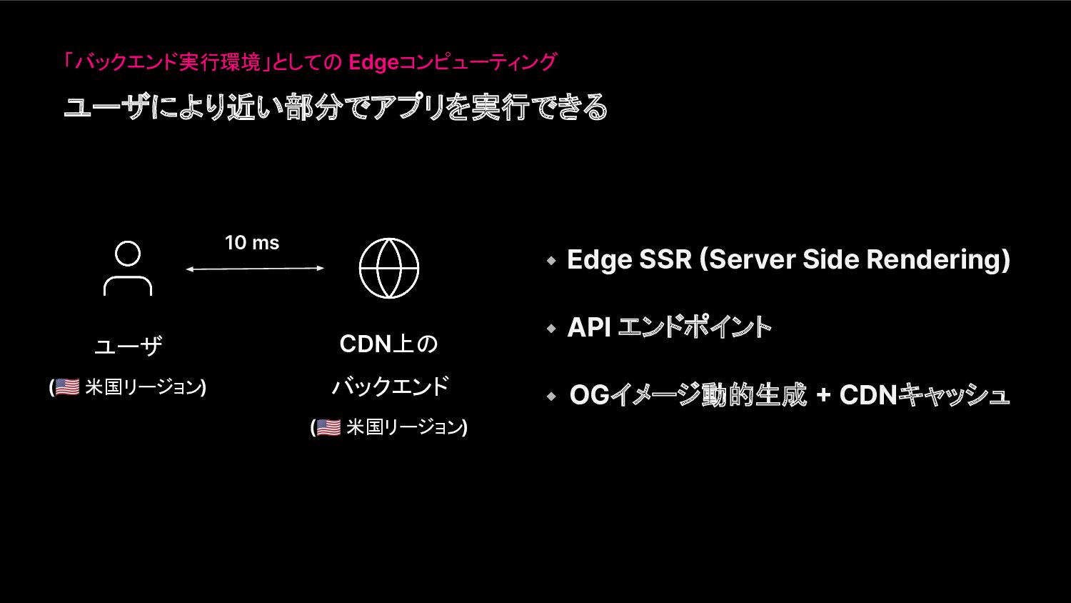 ユーザにより近い部分でアプリを実行できる 10 ms ユーザ ( 米国リージョン) CDN上の バックエンド ( 米国リージョン)