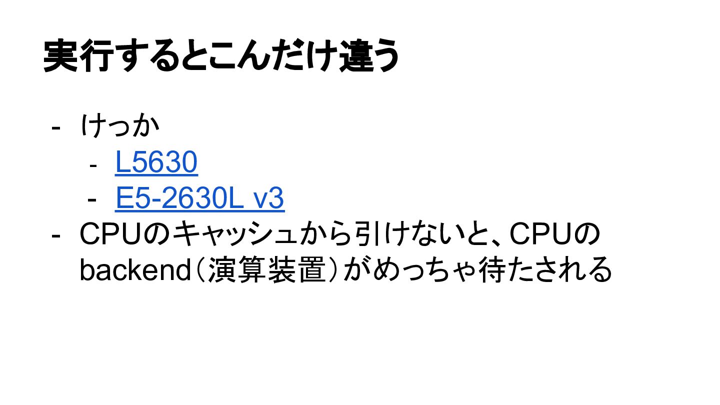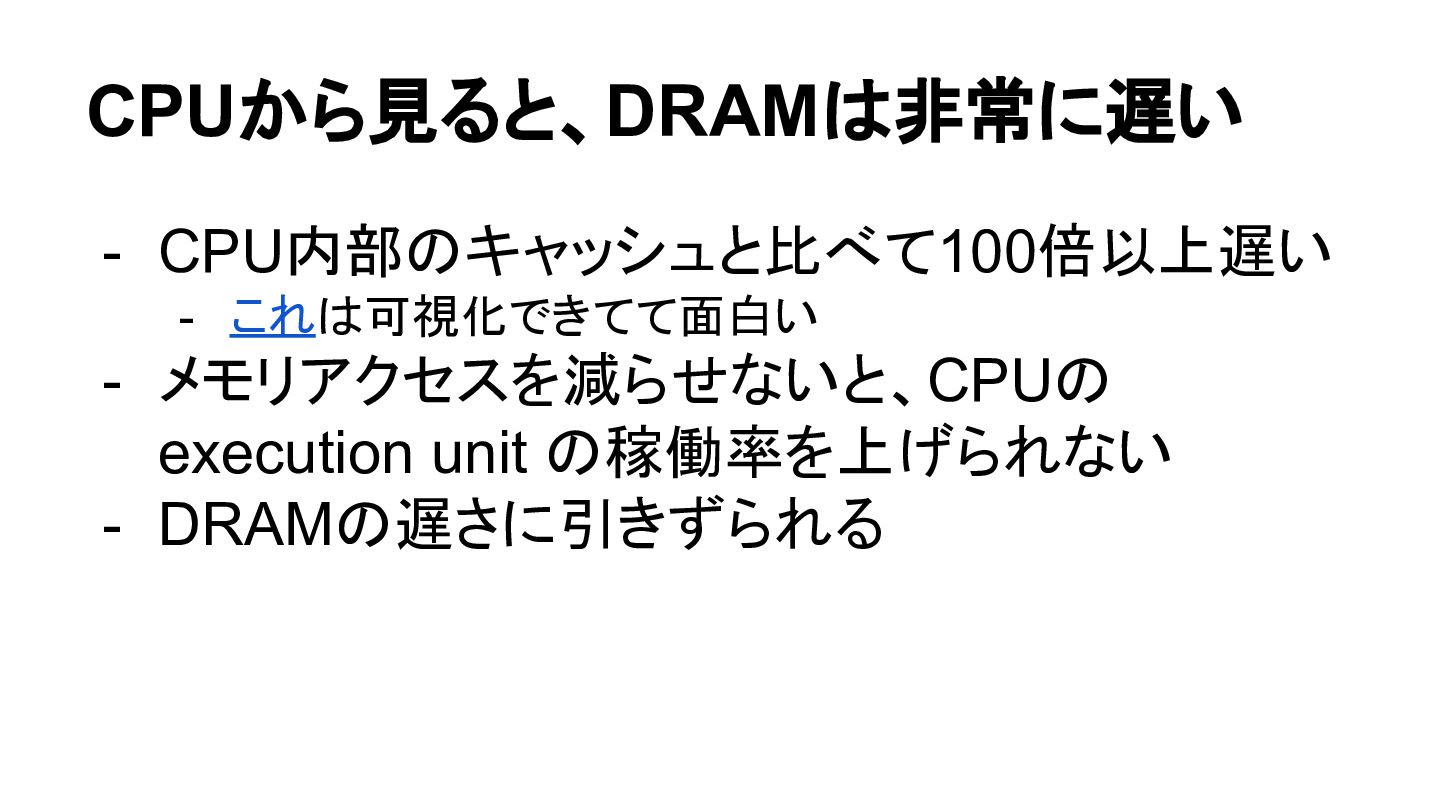 CPUから見ると、DRAMは非常に遅い - CPU内部のキャッシュと比べて100倍以上遅い - これは可視化できてて面白い - メモリアクセスを減らせないと、CPUの execution unit の稼働率を上げられない