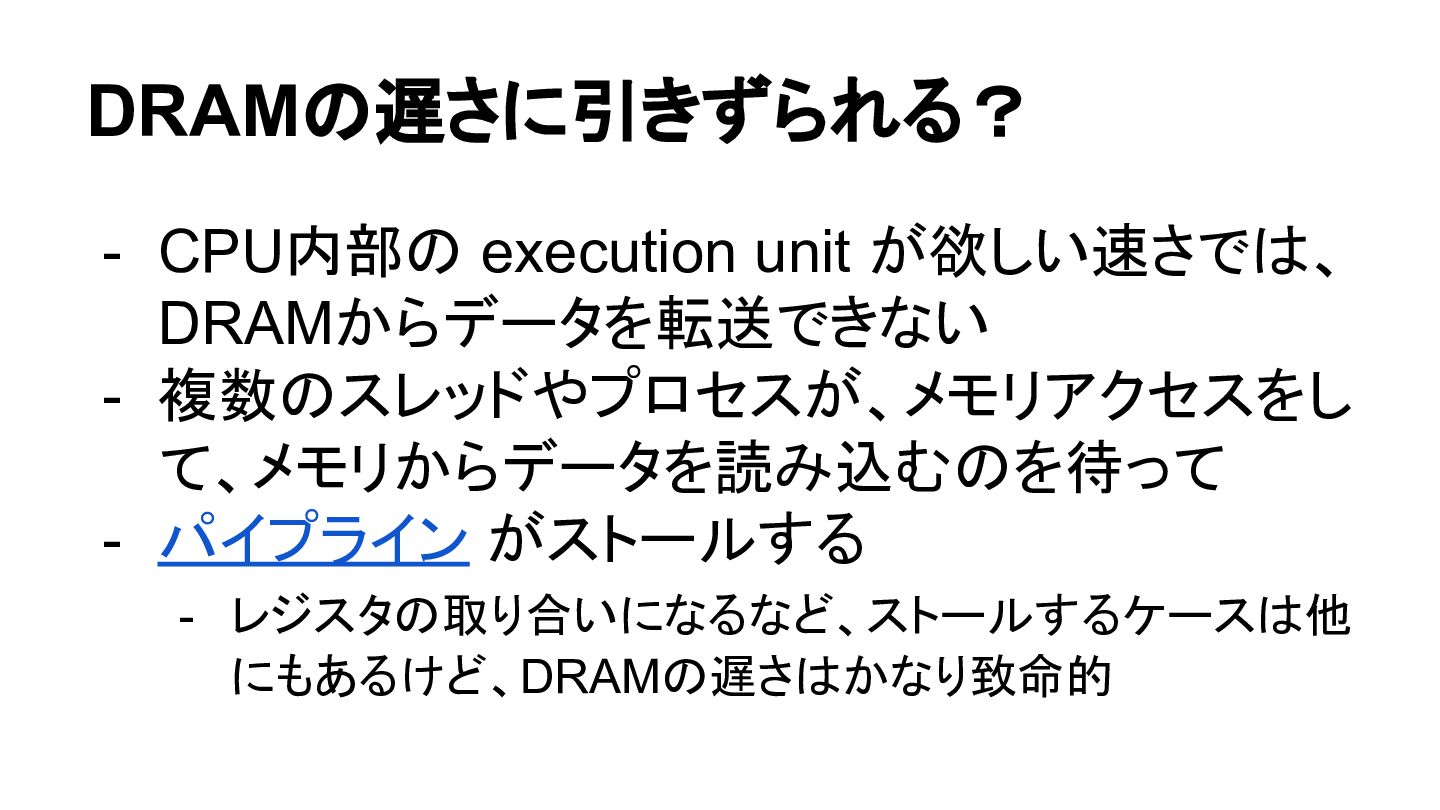 - パイプライン がストールする - レジスタの取り合いになるなど、ストールするケースは他 にもあるけど、DRAMの遅さはかなり致命的