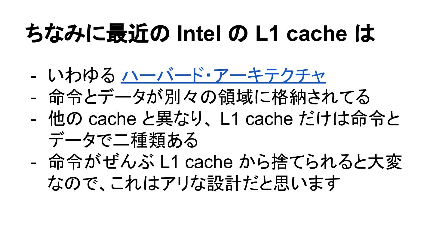 命令とデータが別々の領域に格納されてる - 他の cache と異なり、 L1 cache だけは命令と データで二種類ある - 命令がぜんぶ L1 cache から捨てられると大変 なので、これはアリな設計だと思います