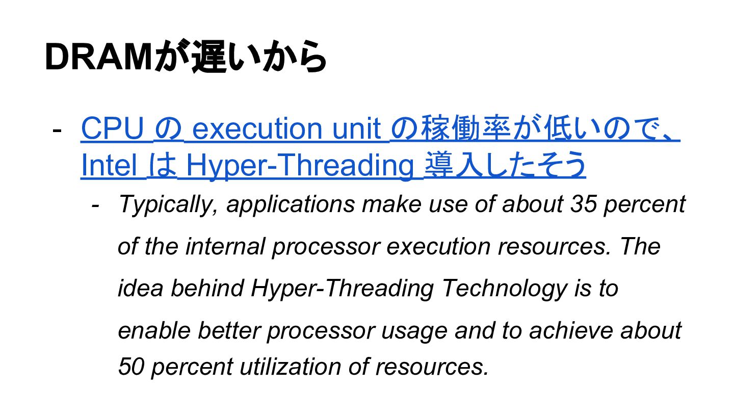 DRAMが遅いから - CPU の execution unit の稼働率が低いので、 Intel は Hyper-Threading