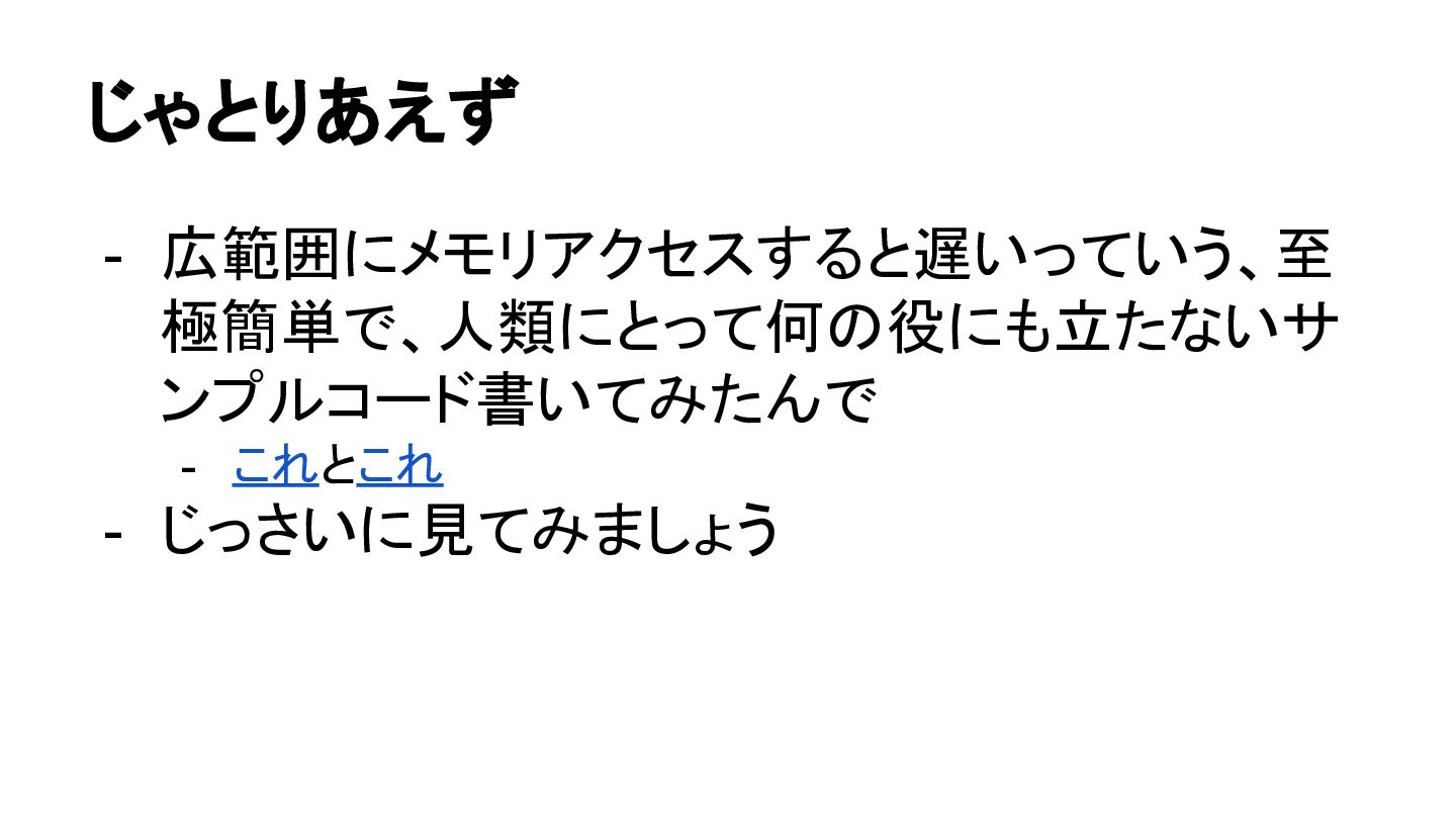 じゃとりあえず - 広範囲にメモリアクセスすると遅いっていう、至 極簡単で、人類にとって何の役にも立たないサ ンプルコード書いてみたんで - これとこれ - じっさいに見てみましょう