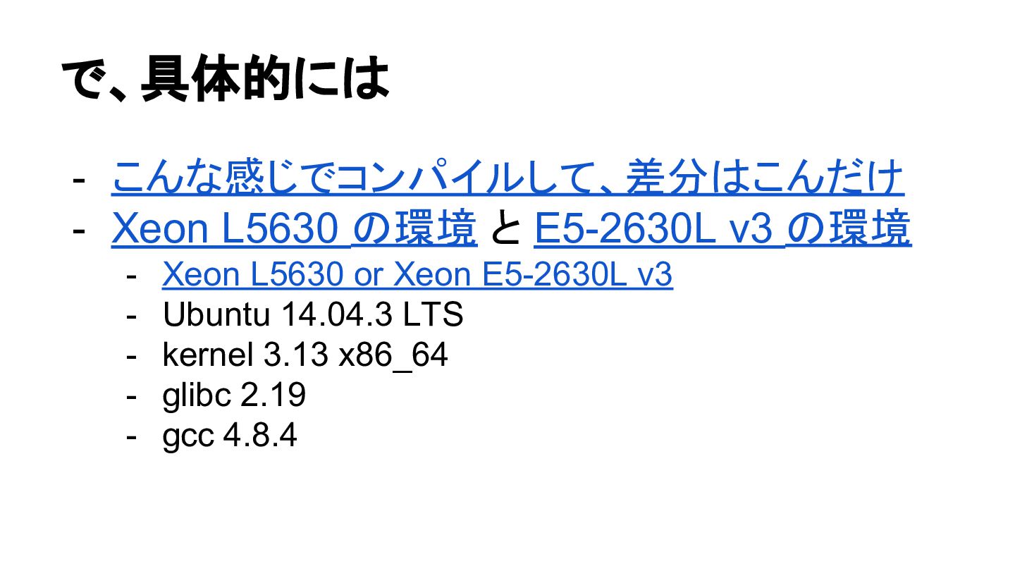 の環境 - Xeon L5630 or Xeon E5-2630L v3 - Ubuntu 14.04.3 LTS - kernel 3.13 x86_64 - glibc 2.19 - gcc 4.8.4